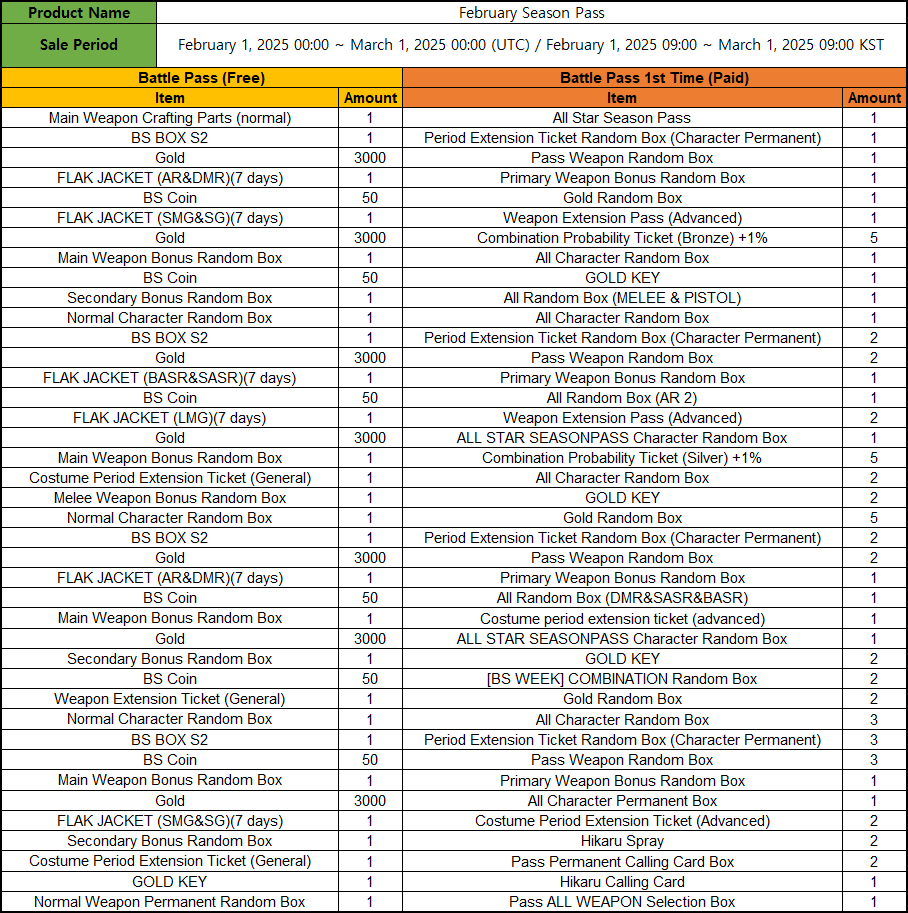 ▶ Period: February 1, 2025 09:00 ~ March 1, 2025 09:00 ▶ Premium Battle Pass final stage rewards will only change for the Season Pass. - Free Battle Pass Level 40 Reward: 1 Normal Weapon Permanent Random Box - New Premium Battle Pass Reward Level 37 Reward: Hikaru Spray Paint - Premium Battle Pass Level 39 and 40 Reward: Hikaru Exclusive Calling Card and Pass ALL WEAPON Selection Box