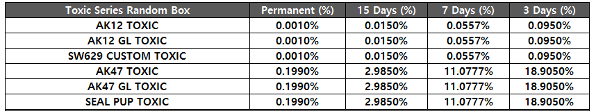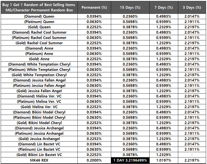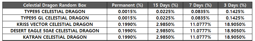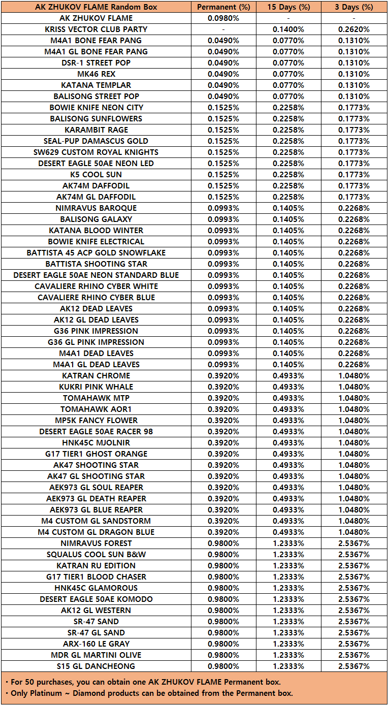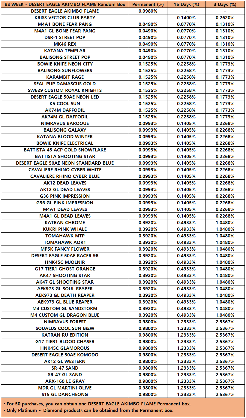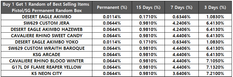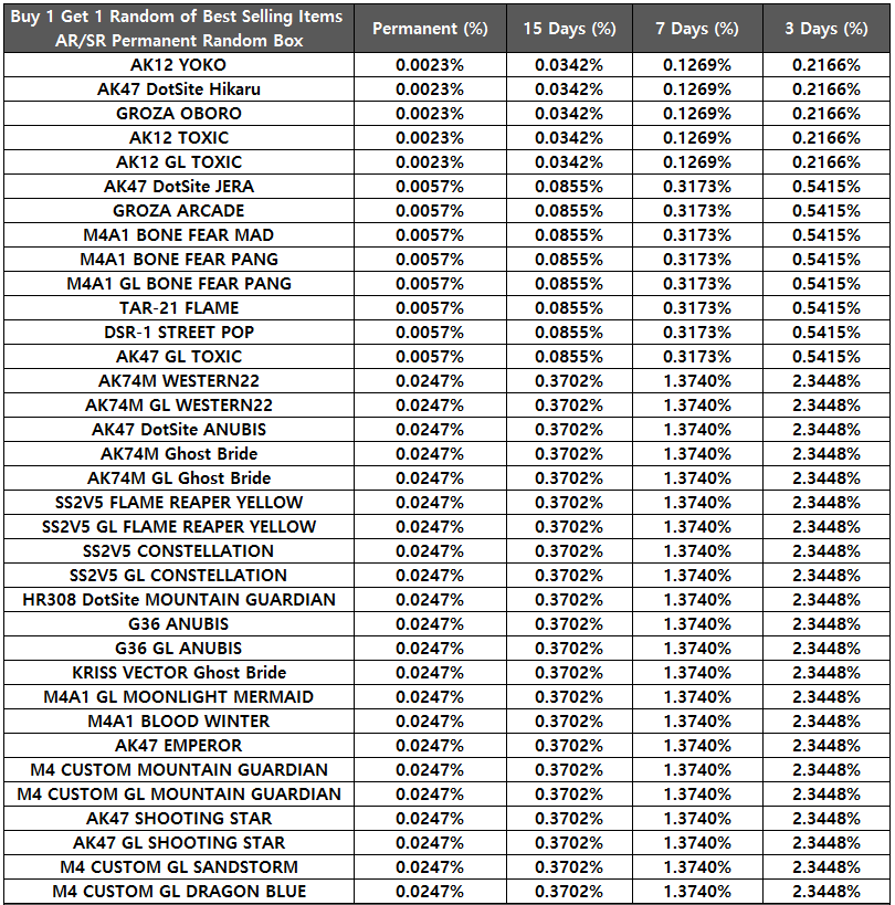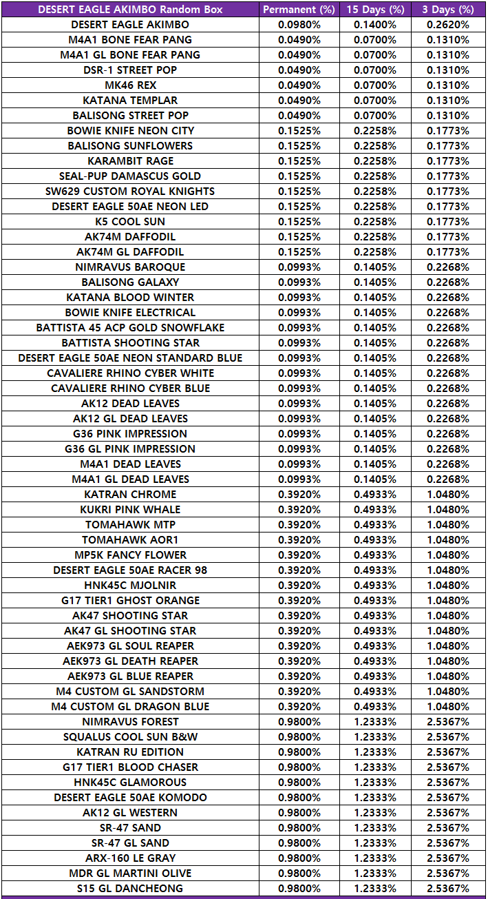 [table][tr][th]DESERT EAGLE AKIMBO YOKO Random Box[/th][th]Permanent (%)[/th][th]15 Days (%)[/th][th]3 Days (%)[/th][/tr][tr][td]DESERT EAGLE AKIMBO YOKO[/td][td]0.0980%[/td][td]0.1400%[/td][td]0.2620%[/td][/tr][tr][td]M4A1 BONE FEAR PANG[/td][td]0.0490%[/td][td]0.0770%[/td][td]0.1310%[/td][/tr][tr][td]M4A1 GL BONE FEAR PANG[/td][td]0.0490%[/td][td]0.0770%[/td][td]0.1310%[/td][/tr][tr][td]DSR-1 STREET POP[/td][td]0.0490%[/td][td]0.0770%[/td][td]0.1310%[/td][/tr][tr][td]MK46 REX[/td][td]0.0490%[/td][td]0.0770%[/td][td]0.1310%[/td][/tr][tr][td]KATANA TEMPLAR[/td][td]0.0490%[/td][td]0.0770%[/td][td]0.1310%[/td][/tr][tr][td]BALISONG STREET POP[/td][td]0.0490%[/td][td]0.0770%[/td][td]0.1310%[/td][/tr][tr][td]BOWIE KNIFE NEON CITY[/td][td]0.1525%[/td][td]0.2258%[/td][td]0.1773%[/td][/tr][tr][td]BALISONG SUNFLOWERS[/td][td]0.1525%[/td][td]0.2258%[/td][td]0.1773%[/td][/tr][tr][td]KARAMBIT RAGE[/td][td]0.1525%[/td][td]0.2258%[/td][td]0.1773%[/td][/tr][tr][td]SEAL-PUP DAMASCUS GOLD[/td][td]0.1525%[/td][td]0.2258%[/td][td]0.1773%[/td][/tr][tr][td]SW629 CUSTOM ROYAL KNIGHTS[/td][td]0.1525%[/td][td]0.2258%[/td][td]0.1773%[/td][/tr][tr][td]DESERT EAGLE 50AE NEON LED[/td][td]0.1525%[/td][td]0.2258%[/td][td]0.1773%[/td][/tr][tr][td]K5 COOL SUN[/td][td]0.1525%[/td][td]0.2258%[/td][td]0.1773%[/td][/tr][tr][td]AK74M DAFFODIL[/td][td]0.1525%[/td][td]0.2258%[/td][td]0.1773%[/td][/tr][tr][td]AK74M GL DAFFODIL[/td][td]0.1525%[/td][td]0.2258%[/td][td]0.1773%[/td][/tr][tr][td]NIMRAVUS BAROQUE[/td][td]0.0993%[/td][td]0.1405%[/td][td]0.2268%[/td][/tr][tr][td]BALISONG GALAXY[/td][td]0.0993%[/td][td]0.1405%[/td][td]0.2268%[/td][/tr][tr][td]KATANA BLOOD WINTER[/td][td]0.0993%[/td][td]0.1405%[/td][td]0.2268%[/td][/tr][tr][td]BOWIE KNIFE ELECTRICAL[/td][td]0.0993%[/td][td]0.1405%[/td][td]0.2268%[/td][/tr][tr][td]BATTISTA 45 ACP GOLD SNOWFLAKE[/td][td]0.0993%[/td][td]0.1405%[/td][td]0.2268%[/td][/tr][tr][td]BATTISTA SHOOTING STAR[/td][td]0.0993%[/td][td]0.1405%[/td][td]0.2268%[/td][/tr][tr][td]DESERT EAGLE 50AE NEON STANDARD BLUE[/td][td]0.0993%[/td][td]0.1405%[/td][td]0.2268%[/td][/tr][tr][td]CAVALIERE RHINO CYBER WHITE[/td][td]0.0993%[/td][td]0.1405%[/td][td]0.2268%[/td][/tr][tr][td]CAVALIERE RHINO CYBER BLUE[/td][td]0.0993%[/td][td]0.1405%[/td][td]0.2268%[/td][/tr][tr][td]AK12 DEAD LEAVES[/td][td]0.0993%[/td][td]0.1405%[/td][td]0.2268%[/td][/tr][tr][td]AK12 GL DEAD LEAVES[/td][td]0.0993%[/td][td]0.1405%[/td][td]0.2268%[/td][/tr][tr][td]G36 PINK IMPRESSION[/td][td]0.0993%[/td][td]0.1405%[/td][td]0.2268%[/td][/tr][tr][td]G36 GL PINK IMPRESSION[/td][td]0.0993%[/td][td]0.1405%[/td][td]0.2268%[/td][/tr][tr][td]M4A1 DEAD LEAVES[/td][td]0.0993%[/td][td]0.1405%[/td][td]0.2268%[/td][/tr][tr][td]M4A1 GL DEAD LEAVES[/td][td]0.0993%[/td][td]0.1405%[/td][td]0.2268%[/td][/tr][tr][td]KATRAN CHROME[/td][td]0.3920%[/td][td]0.4933%[/td][td]1.0480%[/td][/tr][tr][td]KUKRI PINK WHALE[/td][td]0.3920%[/td][td]0.4933%[/td][td]1.0480%[/td][/tr][tr][td]TOMAHAWK MTP[/td][td]0.3920%[/td][td]0.4933%[/td][td]1.0480%[/td][/tr][tr][td]TOMAHAWK AOR1[/td][td]0.3920%[/td][td]0.4933%[/td][td]1.0480%[/td][/tr][tr][td]MP5K FANCY FLOWER[/td][td]0.3920%[/td][td]0.4933%[/td][td]1.0480%[/td][/tr][tr][td]DESERT EAGLE 50AE RACER 98[/td][td]0.3920%[/td][td]0.4933%[/td][td]1.0480%[/td][/tr][tr][td]HNK45C MJOLNIR[/td][td]0.3920%[/td][td]0.4933%[/td][td]1.0480%[/td][/tr][tr][td]G17 TIER1 GHOST ORANGE[/td][td]0.3920%[/td][td]0.4933%[/td][td]1.0480%[/td][/tr][tr][td]AK47 SHOOTING STAR[/td][td]0.3920%[/td][td]0.4933%[/td][td]1.0480%[/td][/tr][tr][td]AK47 GL SHOOTING STAR[/td][td]0.3920%[/td][td]0.4933%[/td][td]1.0480%[/td][/tr][tr][td]AEK973 GL SOUL REAPER[/td][td]0.3920%[/td][td]0.4933%[/td][td]1.0480%[/td][/tr][tr][td]AEK973 GL DEATH REAPER[/td][td]0.3920%[/td][td]0.4933%[/td][td]1.0480%[/td][/tr][tr][td]AEK973 GL BLUE REAPER[/td][td]0.3920%[/td][td]0.4933%[/td][td]1.0480%[/td][/tr][tr][td]M4 CUSTOM GL SANDSTORM[/td][td]0.3920%[/td][td]0.4933%[/td][td]1.0480%[/td][/tr][tr][td]M4 CUSTOM GL DRAGON BLUE[/td][td]0.3920%[/td][td]0.4933%[/td][td]1.0480%[/td][/tr][tr][td]NIMRAVUS FOREST[/td][td]0.9800%[/td][td]1.2333%[/td][td]2.5367%[/td][/tr][tr][td]SQUALUS COOL SUN B&W[/td][td]0.9800%[/td][td]1.2333%[/td][td]2.5367%[/td][/tr][tr][td]KATRAN RU EDITION[/td][td]0.9800%[/td][td]1.2333%[/td][td]2.5367%[/td][/tr][tr][td]G17 TIER1 BLOOD CHASER[/td][td]0.9800%[/td][td]1.2333%[/td][td]2.5367%[/td][/tr][tr][td]HNK45C GLAMOROUS[/td][td]0.9800%[/td][td]1.2333%[/td][td]2.5367%[/td][/tr][tr][td]DESERT EAGLE 50AE KOMODO[/td][td]0.9800%[/td][td]1.2333%[/td][td]2.5367%[/td][/tr][tr][td]AK12 GL WESTERN[/td][td]0.9800%[/td][td]1.2333%[/td][td]2.5367%[/td][/tr][tr][td]SR-47 SAND[/td][td]0.9800%[/td][td]1.2333%[/td][td]2.5367%[/td][/tr][tr][td]SR-47 GL SAND[/td][td]0.9800%[/td][td]1.2333%[/td][td]2.5367%[/td][/tr][tr][td]ARX-160 LE GRAY[/td][td]0.9800%[/td][td]1.2333%[/td][td]2.5367%[/td][/tr][tr][td]MDR GL MARTINI OLIVE[/td][td]0.9800%[/td][td]1.2333%[/td][td]2.5367%[/td][/tr][tr][td]S15 GL DANCHEONG[/td][td]0.9800%[/td][td]1.2333%[/td][td]2.5367%[/td][/tr][/table]