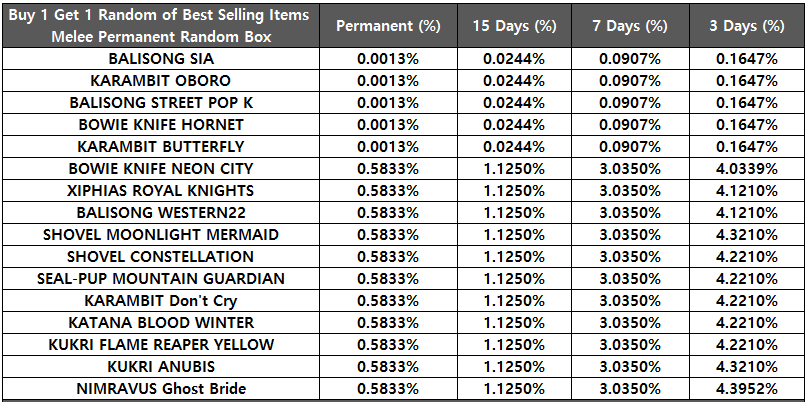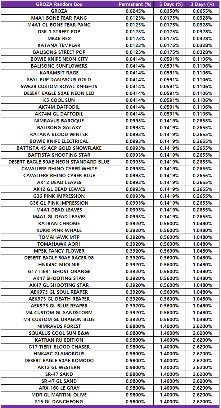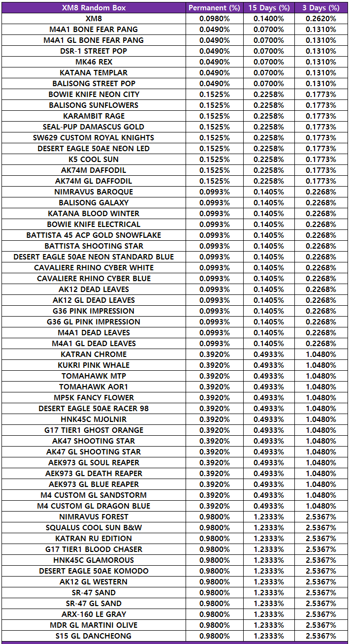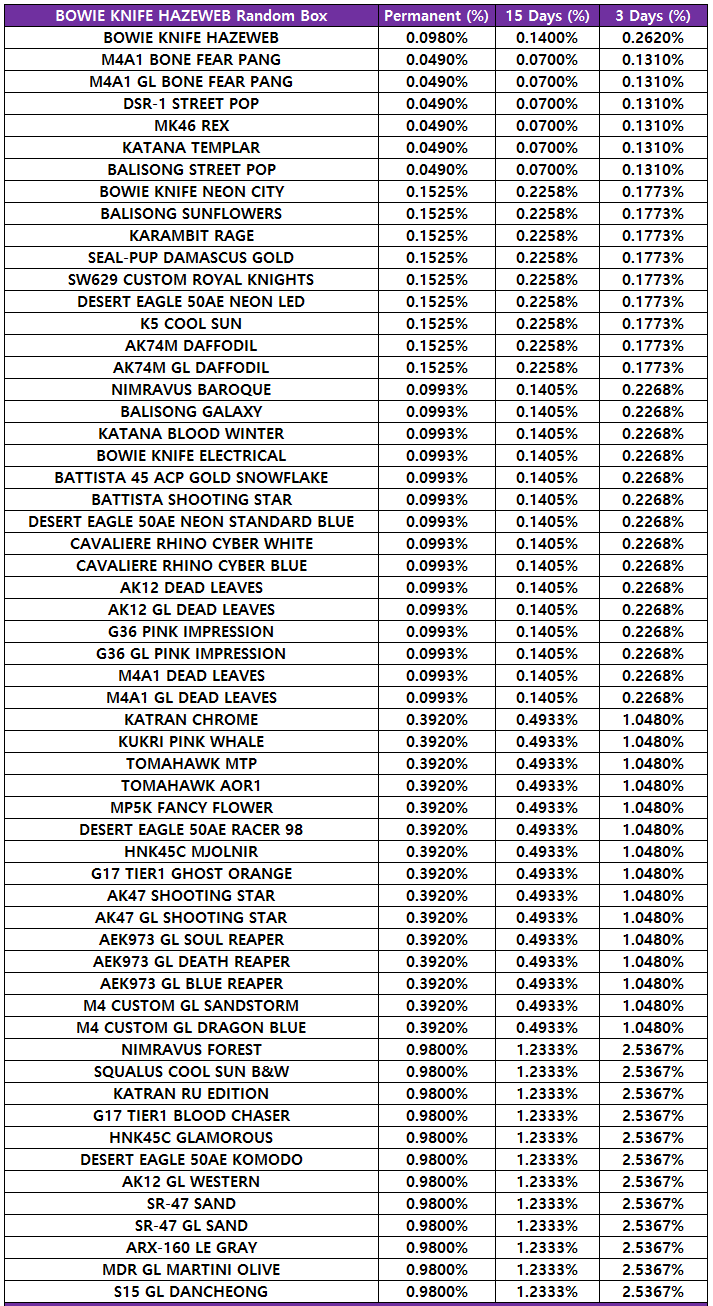 [table][tr][th]KARAMBIT OBORO Random Box[/th][th]Permanent (%)[/th][th]15 Days (%)[/th][th]3 Days (%)[/th][/tr][tr][td]KARAMBIT OBORO[/td][td]0.0980%[/td][td]0.1400%[/td][td]0.2620%[/td][/tr][tr][td]M4A1 BONE FEAR PANG[/td][td]0.0490%[/td][td]0.0770%[/td][td]0.1310%[/td][/tr][tr][td]M4A1 GL BONE FEAR PANG[/td][td]0.0490%[/td][td]0.0770%[/td][td]0.1310%[/td][/tr][tr][td]DSR-1 STREET POP[/td][td]0.0490%[/td][td]0.0770%[/td][td]0.1310%[/td][/tr][tr][td]MK46 REX[/td][td]0.0490%[/td][td]0.0770%[/td][td]0.1310%[/td][/tr][tr][td]KATANA TEMPLAR[/td][td]0.0490%[/td][td]0.0770%[/td][td]0.1310%[/td][/tr][tr][td]BALISONG STREET POP[/td][td]0.0490%[/td][td]0.0770%[/td][td]0.1310%[/td][/tr][tr][td]BOWIE KNIFE NEON CITY[/td][td]0.1525%[/td][td]0.2258%[/td][td]0.1773%[/td][/tr][tr][td]BALISONG SUNFLOWERS[/td][td]0.1525%[/td][td]0.2258%[/td][td]0.1773%[/td][/tr][tr][td]KARAMBIT RAGE[/td][td]0.1525%[/td][td]0.2258%[/td][td]0.1773%[/td][/tr][tr][td]SEAL-PUP DAMASCUS GOLD[/td][td]0.1525%[/td][td]0.2258%[/td][td]0.1773%[/td][/tr][tr][td]SW629 CUSTOM ROYAL KNIGHTS[/td][td]0.1525%[/td][td]0.2258%[/td][td]0.1773%[/td][/tr][tr][td]DESERT EAGLE 50AE NEON LED[/td][td]0.1525%[/td][td]0.2258%[/td][td]0.1773%[/td][/tr][tr][td]K5 COOL SUN[/td][td]0.1525%[/td][td]0.2258%[/td][td]0.1773%[/td][/tr][tr][td]AK74M DAFFODIL[/td][td]0.1525%[/td][td]0.2258%[/td][td]0.1773%[/td][/tr][tr][td]AK74M GL DAFFODIL[/td][td]0.1525%[/td][td]0.2258%[/td][td]0.1773%[/td][/tr][tr][td]NIMRAVUS BAROQUE[/td][td]0.0993%[/td][td]0.1405%[/td][td]0.2268%[/td][/tr][tr][td]BALISONG GALAXY[/td][td]0.0993%[/td][td]0.1405%[/td][td]0.2268%[/td][/tr][tr][td]KATANA BLOOD WINTER[/td][td]0.0993%[/td][td]0.1405%[/td][td]0.2268%[/td][/tr][tr][td]BOWIE KNIFE ELECTRICAL[/td][td]0.0993%[/td][td]0.1405%[/td][td]0.2268%[/td][/tr][tr][td]BATTISTA 45 ACP GOLD SNOWFLAKE[/td][td]0.0993%[/td][td]0.1405%[/td][td]0.2268%[/td][/tr][tr][td]BATTISTA SHOOTING STAR[/td][td]0.0993%[/td][td]0.1405%[/td][td]0.2268%[/td][/tr][tr][td]DESERT EAGLE 50AE NEON STANDARD BLUE[/td][td]0.0993%[/td][td]0.1405%[/td][td]0.2268%[/td][/tr][tr][td]CAVALIERE RHINO CYBER WHITE[/td][td]0.0993%[/td][td]0.1405%[/td][td]0.2268%[/td][/tr][tr][td]CAVALIERE RHINO CYBER BLUE[/td][td]0.0993%[/td][td]0.1405%[/td][td]0.2268%[/td][/tr][tr][td]AK12 DEAD LEAVES[/td][td]0.0993%[/td][td]0.1405%[/td][td]0.2268%[/td][/tr][tr][td]AK12 GL DEAD LEAVES[/td][td]0.0993%[/td][td]0.1405%[/td][td]0.2268%[/td][/tr][tr][td]G36 PINK IMPRESSION[/td][td]0.0993%[/td][td]0.1405%[/td][td]0.2268%[/td][/tr][tr][td]G36 GL PINK IMPRESSION[/td][td]0.0993%[/td][td]0.1405%[/td][td]0.2268%[/td][/tr][tr][td]M4A1 DEAD LEAVES[/td][td]0.0993%[/td][td]0.1405%[/td][td]0.2268%[/td][/tr][tr][td]M4A1 GL DEAD LEAVES[/td][td]0.0993%[/td][td]0.1405%[/td][td]0.2268%[/td][/tr][tr][td]KATRAN CHROME[/td][td]0.3920%[/td][td]0.4933%[/td][td]1.0480%[/td][/tr][tr][td]KUKRI PINK WHALE[/td][td]0.3920%[/td][td]0.4933%[/td][td]1.0480%[/td][/tr][tr][td]TOMAHAWK MTP[/td][td]0.3920%[/td][td]0.4933%[/td][td]1.0480%[/td][/tr][tr][td]TOMAHAWK AOR1[/td][td]0.3920%[/td][td]0.4933%[/td][td]1.0480%[/td][/tr][tr][td]MP5K FANCY FLOWER[/td][td]0.3920%[/td][td]0.4933%[/td][td]1.0480%[/td][/tr][tr][td]DESERT EAGLE 50AE RACER 98[/td][td]0.3920%[/td][td]0.4933%[/td][td]1.0480%[/td][/tr][tr][td]HNK45C MJOLNIR[/td][td]0.3920%[/td][td]0.4933%[/td][td]1.0480%[/td][/tr][tr][td]G17 TIER1 GHOST ORANGE[/td][td]0.3920%[/td][td]0.4933%[/td][td]1.0480%[/td][/tr][tr][td]AK47 SHOOTING STAR[/td][td]0.3920%[/td][td]0.4933%[/td][td]1.0480%[/td][/tr][tr][td]AK47 GL SHOOTING STAR[/td][td]0.3920%[/td][td]0.4933%[/td][td]1.0480%[/td][/tr][tr][td]AEK973 GL SOUL REAPER[/td][td]0.3920%[/td][td]0.4933%[/td][td]1.0480%[/td][/tr][tr][td]AEK973 GL DEATH REAPER[/td][td]0.3920%[/td][td]0.4933%[/td][td]1.0480%[/td][/tr][tr][td]AEK973 GL BLUE REAPER[/td][td]0.3920%[/td][td]0.4933%[/td][td]1.0480%[/td][/tr][tr][td]M4 CUSTOM GL SANDSTORM[/td][td]0.3920%[/td][td]0.4933%[/td][td]1.0480%[/td][/tr][tr][td]M4 CUSTOM GL DRAGON BLUE[/td][td]0.3920%[/td][td]0.4933%[/td][td]1.0480%[/td][/tr][tr][td]NIMRAVUS FOREST[/td][td]0.9800%[/td][td]1.2333%[/td][td]2.5367%[/td][/tr][tr][td]SQUALUS COOL SUN B&W[/td][td]0.9800%[/td][td]1.2333%[/td][td]2.5367%[/td][/tr][tr][td]KATRAN RU EDITION[/td][td]0.9800%[/td][td]1.2333%[/td][td]2.5367%[/td][/tr][tr][td]G17 TIER1 BLOOD CHASER[/td][td]0.9800%[/td][td]1.2333%[/td][td]2.5367%[/td][/tr][tr][td]HNK45C GLAMOROUS[/td][td]0.9800%[/td][td]1.2333%[/td][td]2.5367%[/td][/tr][tr][td]DESERT EAGLE 50AE KOMODO[/td][td]0.9800%[/td][td]1.2333%[/td][td]2.5367%[/td][/tr][tr][td]AK12 GL WESTERN[/td][td]0.9800%[/td][td]1.2333%[/td][td]2.5367%[/td][/tr][tr][td]SR-47 SAND[/td][td]0.9800%[/td][td]1.2333%[/td][td]2.5367%[/td][/tr][tr][td]SR-47 GL SAND[/td][td]0.9800%[/td][td]1.2333%[/td][td]2.5367%[/td][/tr][tr][td]ARX-160 LE GRAY[/td][td]0.9800%[/td][td]1.2333%[/td][td]2.5367%[/td][/tr][tr][td]MDR GL MARTINI OLIVE[/td][td]0.9800%[/td][td]1.2333%[/td][td]2.5367%[/td][/tr][tr][td]S15 GL DANCHEONG[/td][td]0.9800%[/td][td]1.2333%[/td][td]2.5367%[/td][/tr][/table]