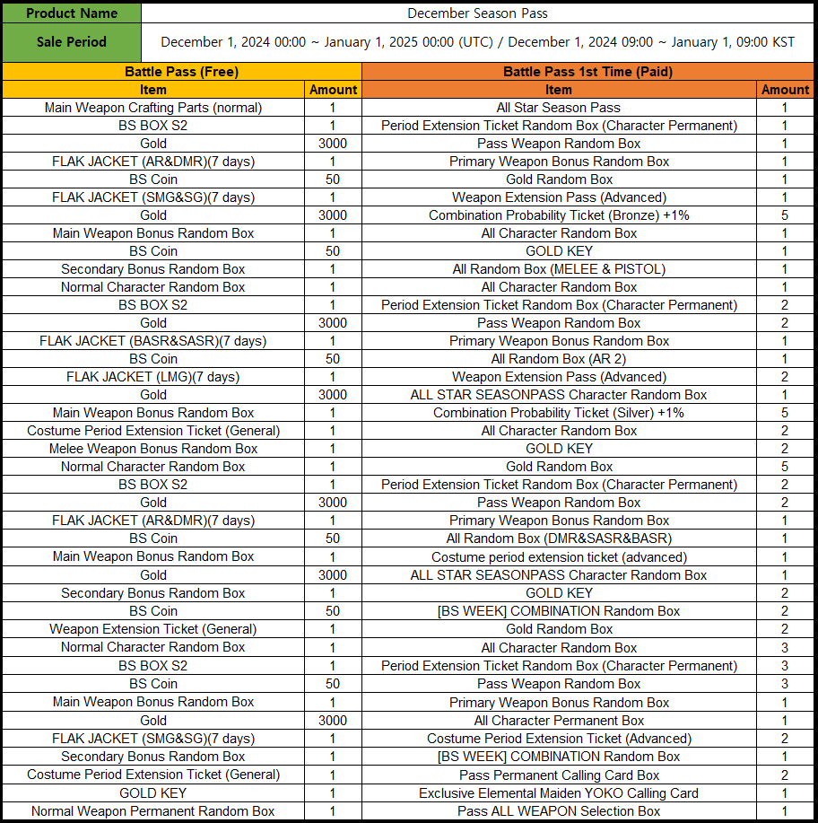 Information on December Season Pass benefits ▶ Period: December 1, 2024 09:00 ~ January 1, 2025 09:00 ▶ Premium Battle Pass final stage rewards will only change for the Season Pass. - Free Battle Pass Level 40 Reward: 1 Normal Weapon Permanent Random Box - Premium Battle Pass level 39 and 40 reward: Elemental Maiden YOKO Exclusive Calling Card and Pass ALL WEAPON Selection Box