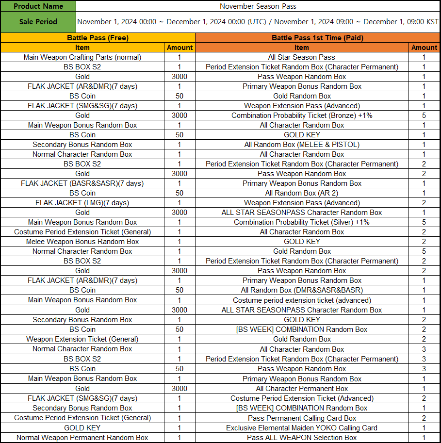 ▶ Period: November 1, 2024 09:00 ~ December 1, 2024 09:00 ▶ Premium Battle Pass final stage rewards will only change for the Season Pass. - Free Battle Pass Level 40 Reward: 1 Normal Weapon Permanent Random Box - Premium Battle Pass level 39 and 40 reward: Elemental Maiden YOKO Exclusive Calling Card and Pass ALL WEAPON Selection Box