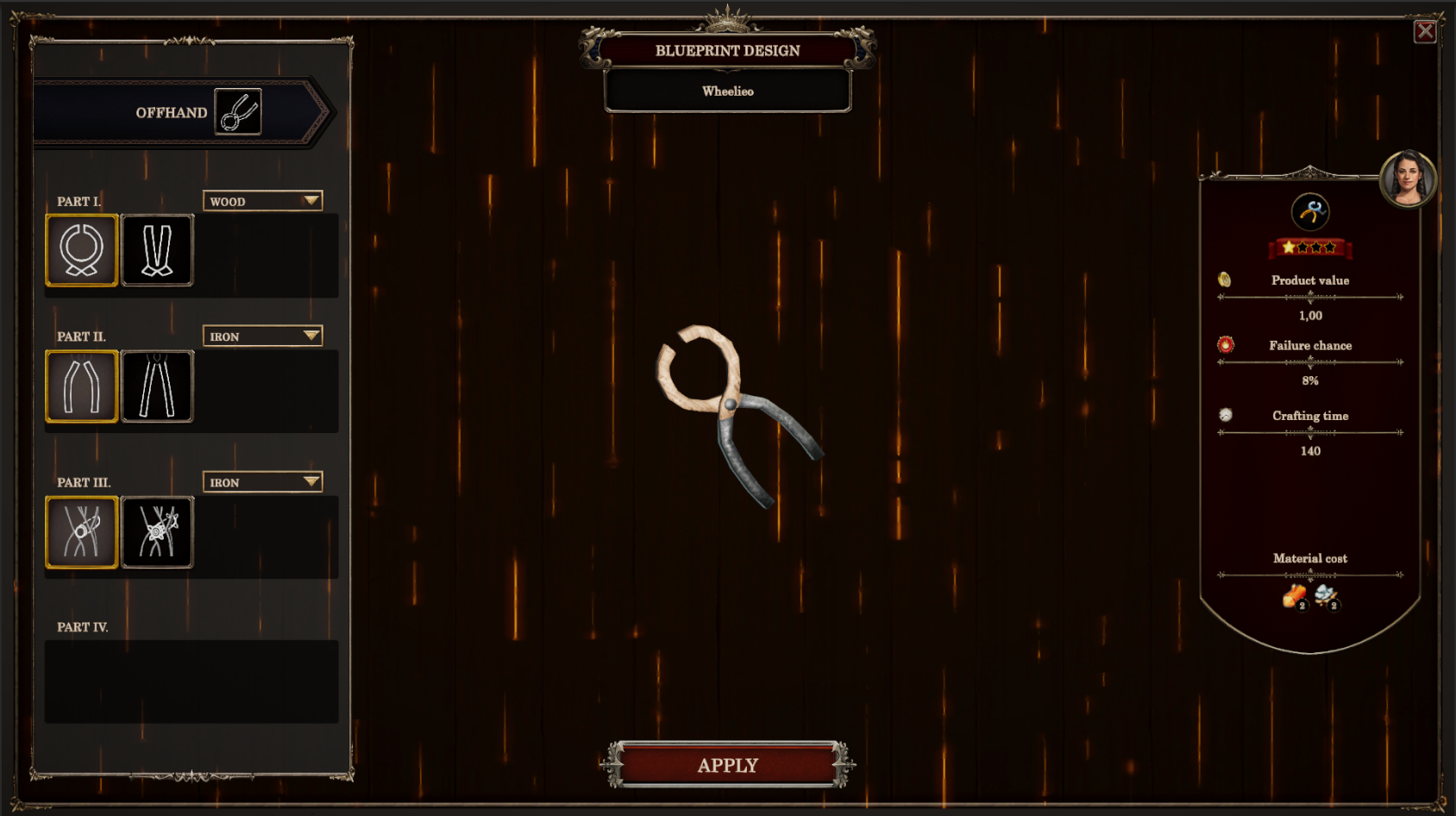 I was literally dreaming before of doing something like this in the game but never had knowledge to do that. Well now I can lol! Each blueprint will be applied to an item that you will be able to craft. They can be changed any time for now and different shapes will provide different outcome. In the beginning you only choose handle and head but later there will be 2 additional configurations, so total of 4 changeable things for each blueprint type...hopefully :) Item types remained the same, so you will just start from Agriculture and move on to other like before. Point is to get player close to the blacksmithing itself. Previous model strayed a bit too far from my original idea.