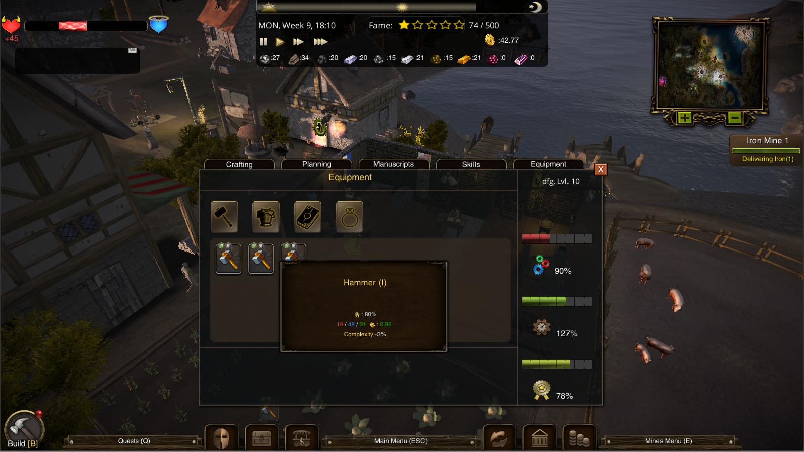 - working hour button will now show correct working hours number and redirects player to the menu upon mouse click - Treasury HUD will now pop always on Monday listing all expenses properly and reseting the weekly chest in Tavern - after losing a battle, group icon will properly disappear and exploration will be possible when heroes are ready - Lesser scroll of glory will be now properly crafted - fixed a bug with Blacksmith 1 menu tab displays - fixed a bug where Shopping Fever quest enabled made World map accessible - item not sold due to market being closed will now properly set back for sale after the market re-opens - fixed a bug where screen resolution change buttons were not working - accepting/declining quest will now put player back into pause (if his game was paused before that) - fixed missing pop-up for cracks in different languages and some FR language errors - player will start from 7am now, so character won't disappear and then reappear - fixed a bug where player could place Overseer sooner than Blacksmith, thus breaking the tutorial - fixed a bug where Drezhul hero could summon more than 2 skeletons in one fight - Holy staff will be properly counted as 2 handed weapon, removing shield upon equip - alchemist bookcase and reagents storage can now be placed on whole Wanborne workshop area - ingots are now removed from the Manuscripts menu as they don't fall under the rules as other items - mine displays withing the Mines Menu (E) are now properly aligned - guard in Wanborne won't be stuck forever under the bridge during his partrols - clicking on 'Skills' in Heroes menu will toggle the Skills menu on or off for heroes - bottom menu will now be properly updated with language changes when going to main menu - aligned the Auto production and Inventory space texts when player reached higher quantities of items - equipment menus will have more space for scrollbar in case of more items - game will no longer crash when trying to exit to main menu on 3x speed - FPS counter is now properly displayed above the reputation bar - Runes will now be counted in inventory slot during crafting process - aligned fame count in-game with the one represented in the save file display - fixed a bug where player could leave world map while dungeon menu was still on and spamming hotkeys would break the battle camera when entering battle - fixed Manuscript Complexity calculation for most items as it was way too high