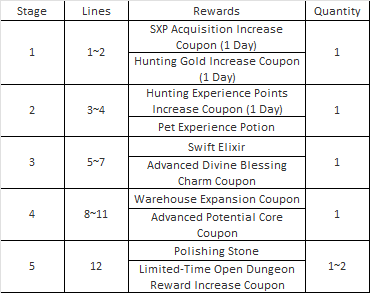 - Content: 1.Servers’ routine maintenance 2.Start New Year's activities (1)The buff event will be held from January 1st to January 5th --When hunting monsters, experience gain increases by 100% --When completing tasks, the skill experience gained increases by 100% --When hunting monsters, the amount of gold coins obtained increases by 100% (2)Sign in activity will be held from January 1st to January 3rd January 1st: Red commemorative dress with added card (7 days) January 2nd: Limited time open dungeon reward increase coupons (3) and first aid books (5) January 3rd: Advanced Divine Blessing Charm Coupons (5) Advanced Potential Core Coupons (5)