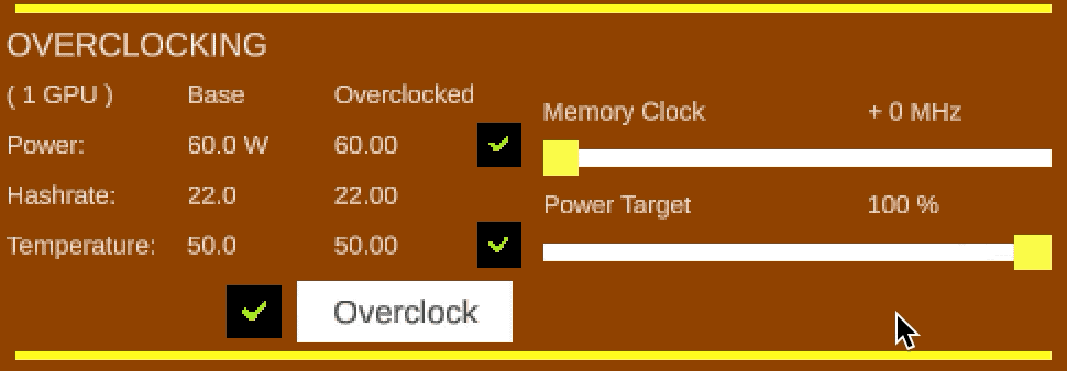 Overclock is setting the clock speed higher to get more speed from a GPU. More speed means more power consumption. This is where the undervolting comes in. Undervolting is decreasing the voltage used by a GPU to consume less power. In the mining world, higher clock speed for a GPU means more hash rates and low power usage means reduced electric bills. Each GPU is unique in its way when it comes to overclocking and undervolting. Miners try different values to find out the optimal values to apply to their GPUs. You have the option to have maximized clock speed as long as the PSU connected to the GPU is adequate enough for such power usage. If you also want to have more power efficient setup, you can decrease the power target of GPU to make it consume less power. Keep in mind that undervolting slightly decreases the hash rate. Here is an example values for a GPU with and without overclocking: