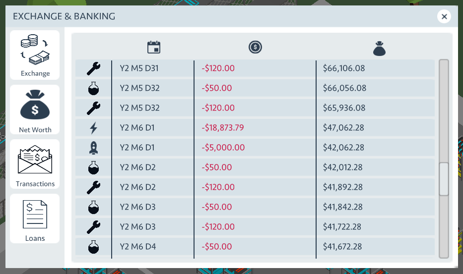 Budget interface shows the money owed to electricity company, workers, researchers.