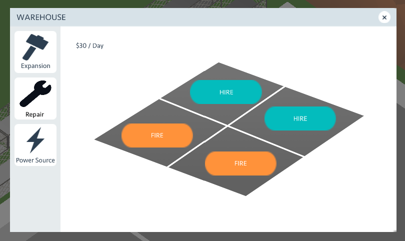 You can hire workers in the warehouse menu. Click on repair button and hire them. Each room has its separate worker. Also, you have to hire them for all warehouses separately. For example, if you had just bought the items in a room, you might not need someone to automatically repair them.