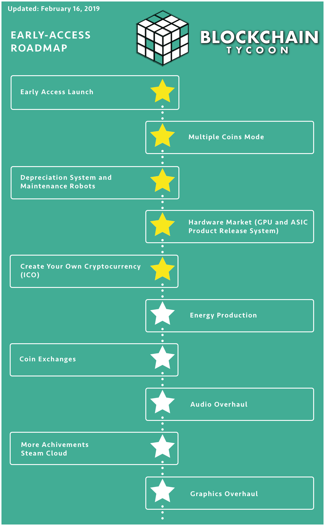 Blockchain Tycoon now has achievements. There are 5 achievements available today and more will follow.
