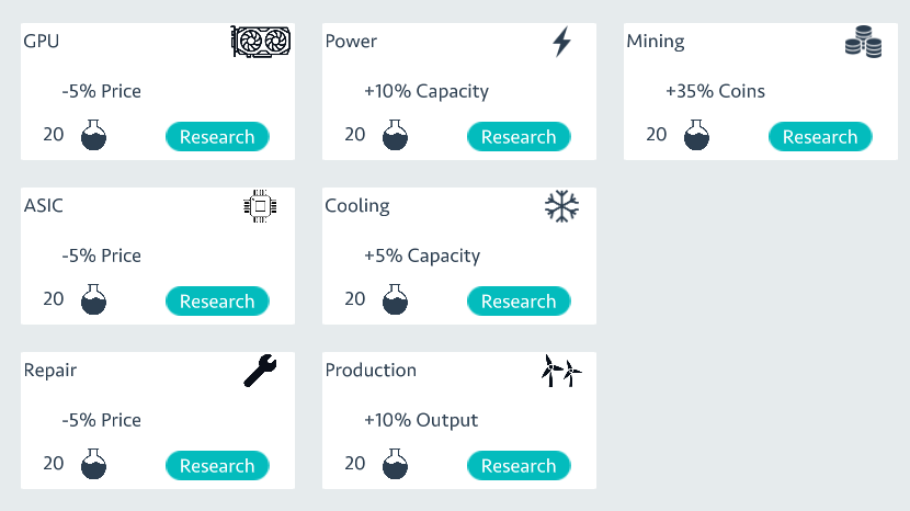 In this update, we have redesigned the research tree. While still having price decrease research for GPU and ASIC, hash-rate research is completely removed from the tree. If you continue from a previous save file, you don’t lose your research points but the previously completed research is erased from the save files.