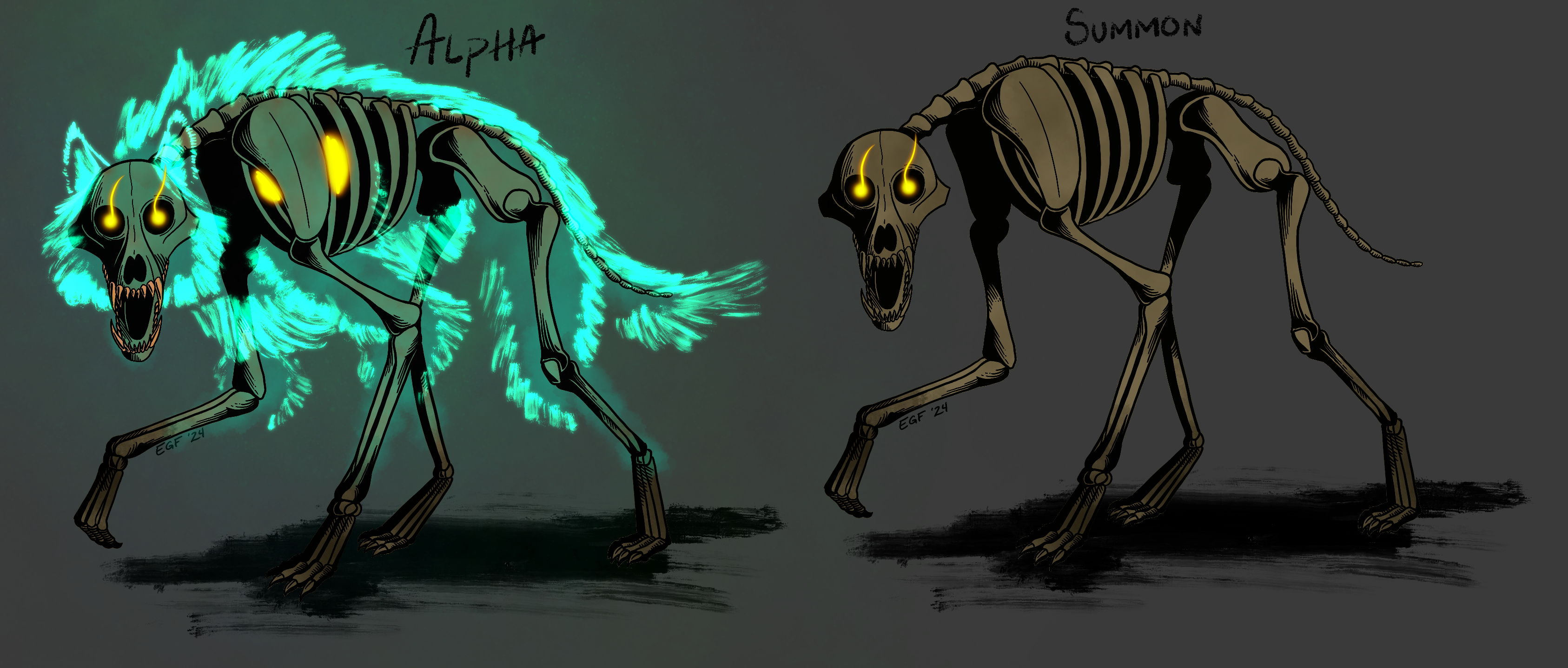 The Alpha is a Skeletal Wolf with a ghostly body, and glowing eyes and heart. And the Summon is the Skeleton with only the glowing eyes. The Wraith Wolf Alpha starts patrolling its territory alone. But when it engages with a target, the Alpha howls, summoning additional skeletal wolves around itself that attack the target directly. While the Summons attack the target, the Alpha circles from the outside, quickly darting back and forth, occasionally stopping to summon additional skeletons at different angles around its target. The Skeletal Summons pull themselves from the ground when spawned, and are brittle, falling relatively easily with no damage resistances. The Alpha is heavily resistant to all damage types outside of Silver, with the glowing heart acting as a greater weak point as opposed to the head. When the Alpha is defeated, any active Summons also fall with it. When defeated, the Alpha's ghostly body evaporates while the bones fall to the ground, and the Skeletal Summons simply fall to the ground.