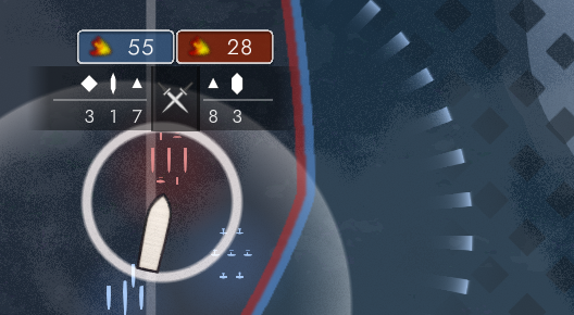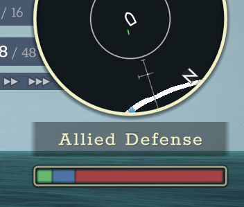 Another issue was that it could sometimes be difficult to see what's on the map, so we added a progress bar that shows the weighted average of the strength of each side. Green shows your squadron boats as well as the call-in aircraft you've called, blue shows your allies and red shows your enemies.