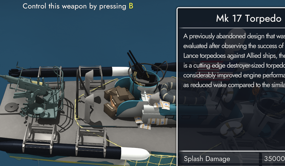 - IJN aircraft weapon nerf. - Torpedo Tube/Rack turned into toggle. - Higgins now has access to torpedo tubes. - Mark 15 (and 17) given a second rack to secure the heavier torpedo better. - M2 Browning cost reduced to 2500 RP from 3500 RP. - Torpedo placement adjustments. - '80 Elco can now carry two rows of Mark 15/17 Torpedoes. - Torpedo visibilities adjusted. - Overboard crew are now tracked in the UI. - 3-inch shell impact sound changes. - Player Bofors now has a flak-like explosion effect and proximity fuse but no shrapnel when targeting aircraft.