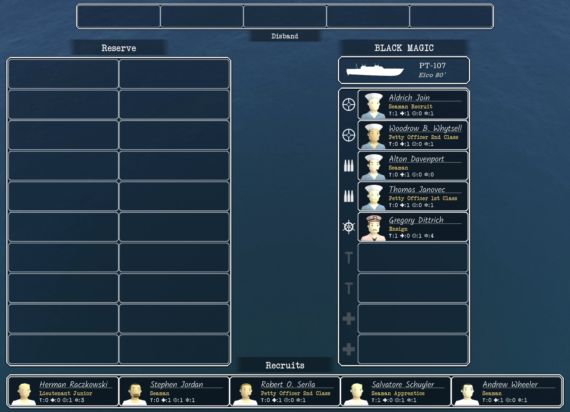 You can also easily dismiss men from the same screen, who will be removed from your team and sent away as soon as you leave the screen. It's also not out of the question to add a button to just dismiss them right away in case you wanted to dismiss more sailors at once than the number of available slots.