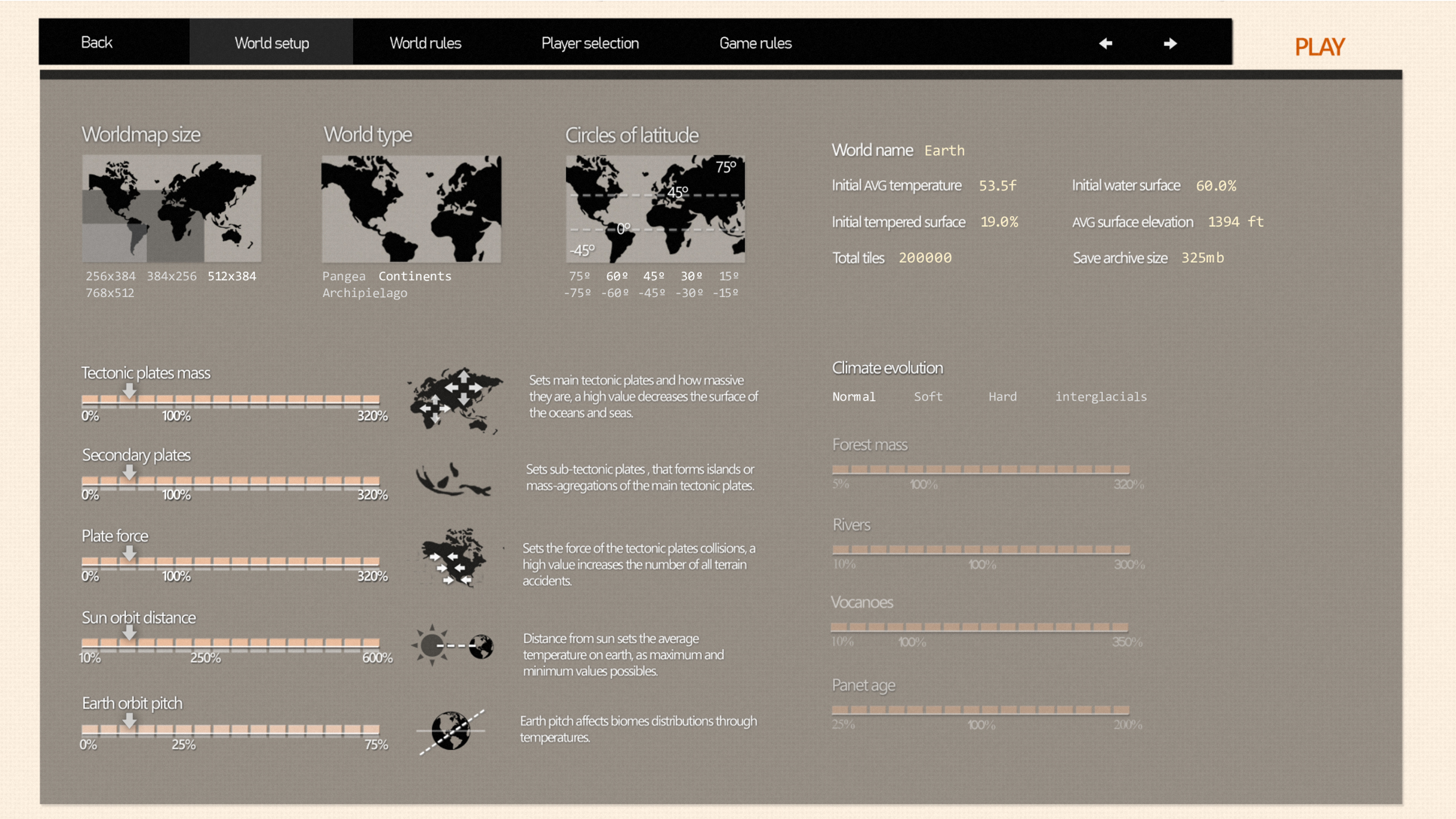 In the top right you can see your initial planet conditions, like the initial averange temperature or the initial sea level, all this params will evolve with the pasage of time, climate simulation is real and bring dinamic conditions: Sea flooding, biome changes, hunt migrations changes / hunt extinctions (Mammoths for eg)