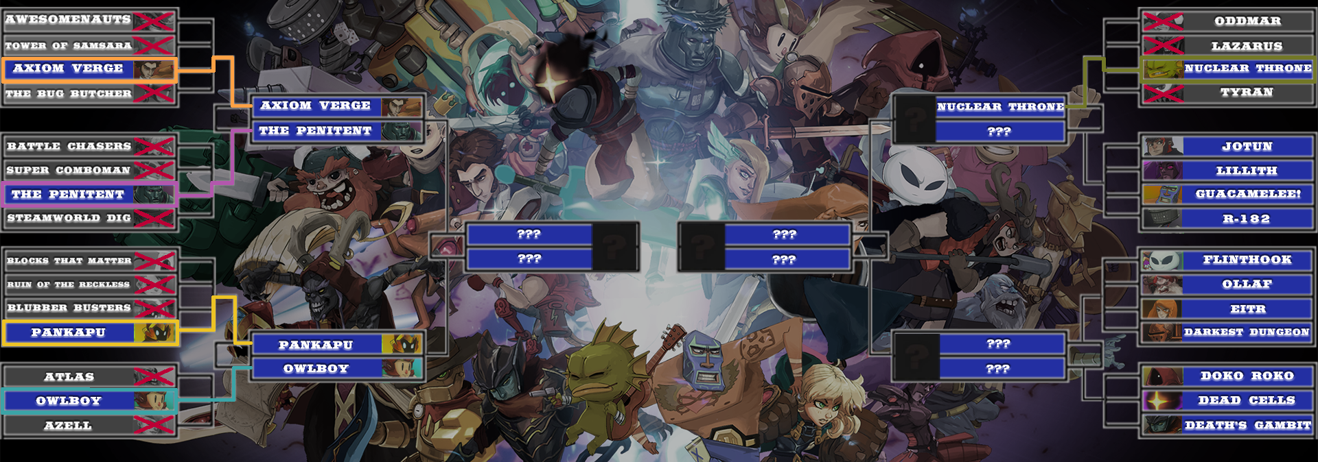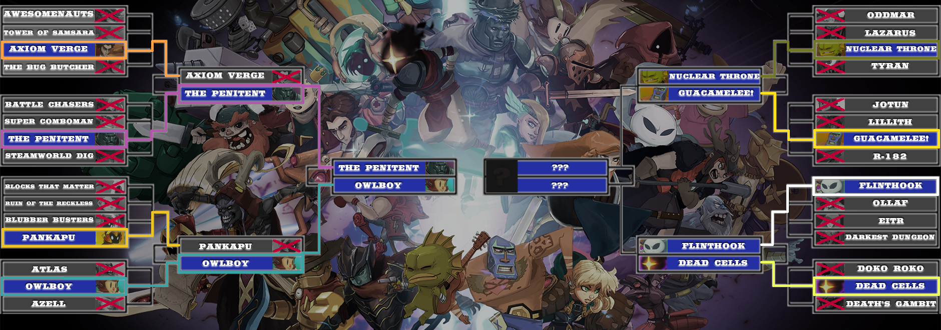 But first, we celebrate the winners of the last two weekly brawls! The winner from round 4 is Otus from Owlboy and last weeks winner is Fish from Nuclear Throne! CONGRATULATIONS to both winners.