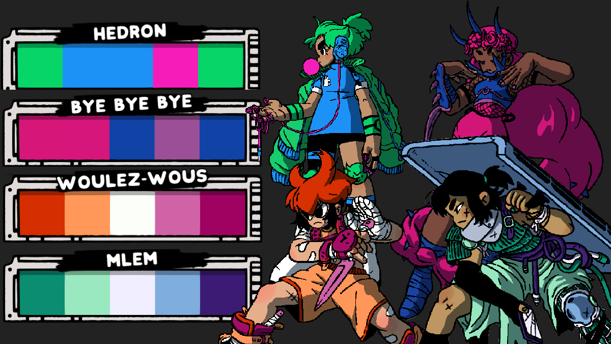 Hey all, we're so glad you've been enjoying the game. This is just a lil' patch to give you a bunch more cosmetic options! Included are a bunch more pride flags, and some new chassis options. Worth highlighting is JB, the colour scheme by our very first community tournament winner, Bolimar! Go talk to Amma and Yasmiin to explore your new options! Below are the new colour schemes, and further below are the full patch notes!
