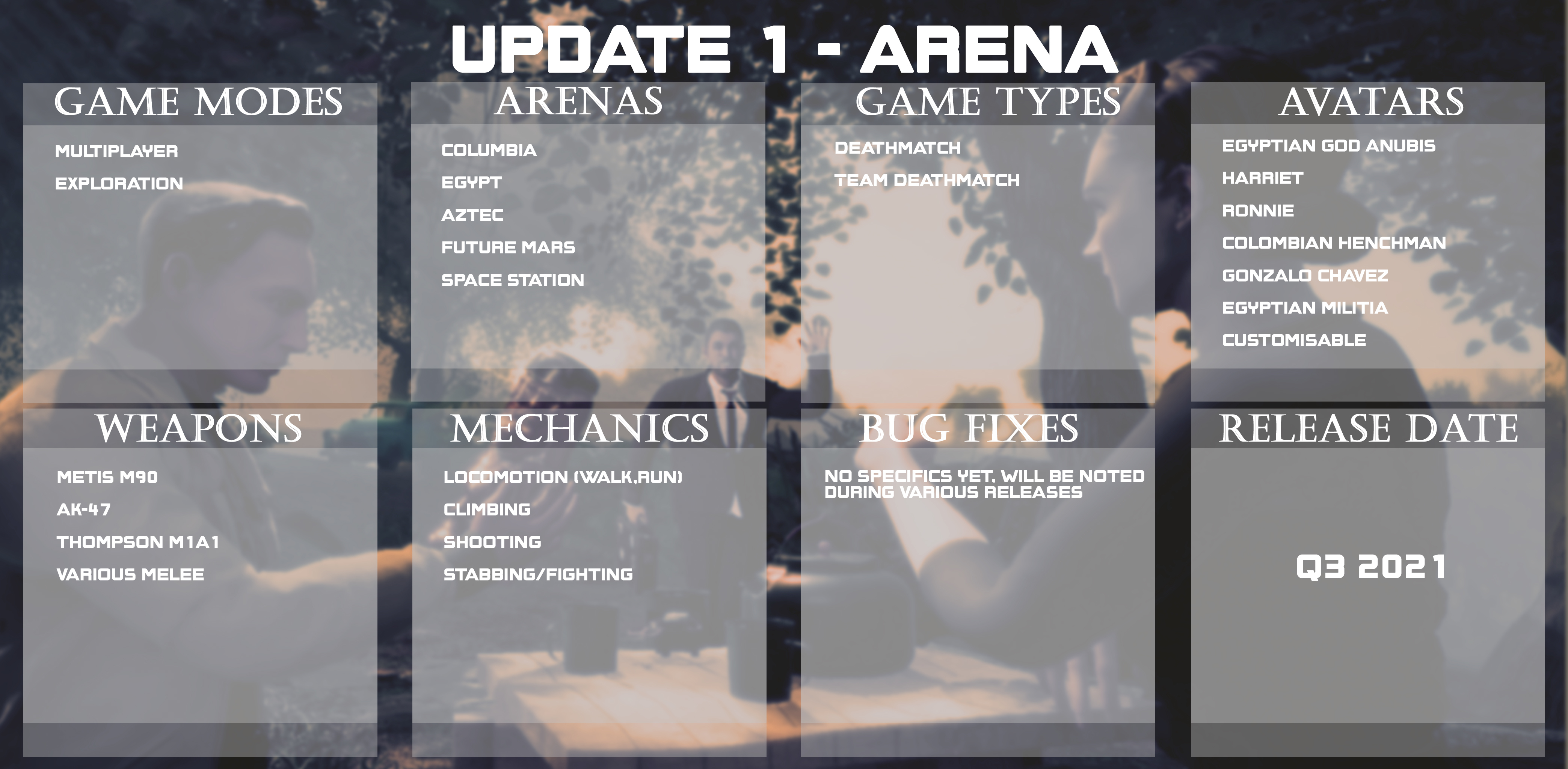 Arenas will be a PVP multiplayer VR game in which players battle it out for dominance or work together in co-op to complete tasks, planting bombs/ taking gold or just fighting for kills and more...