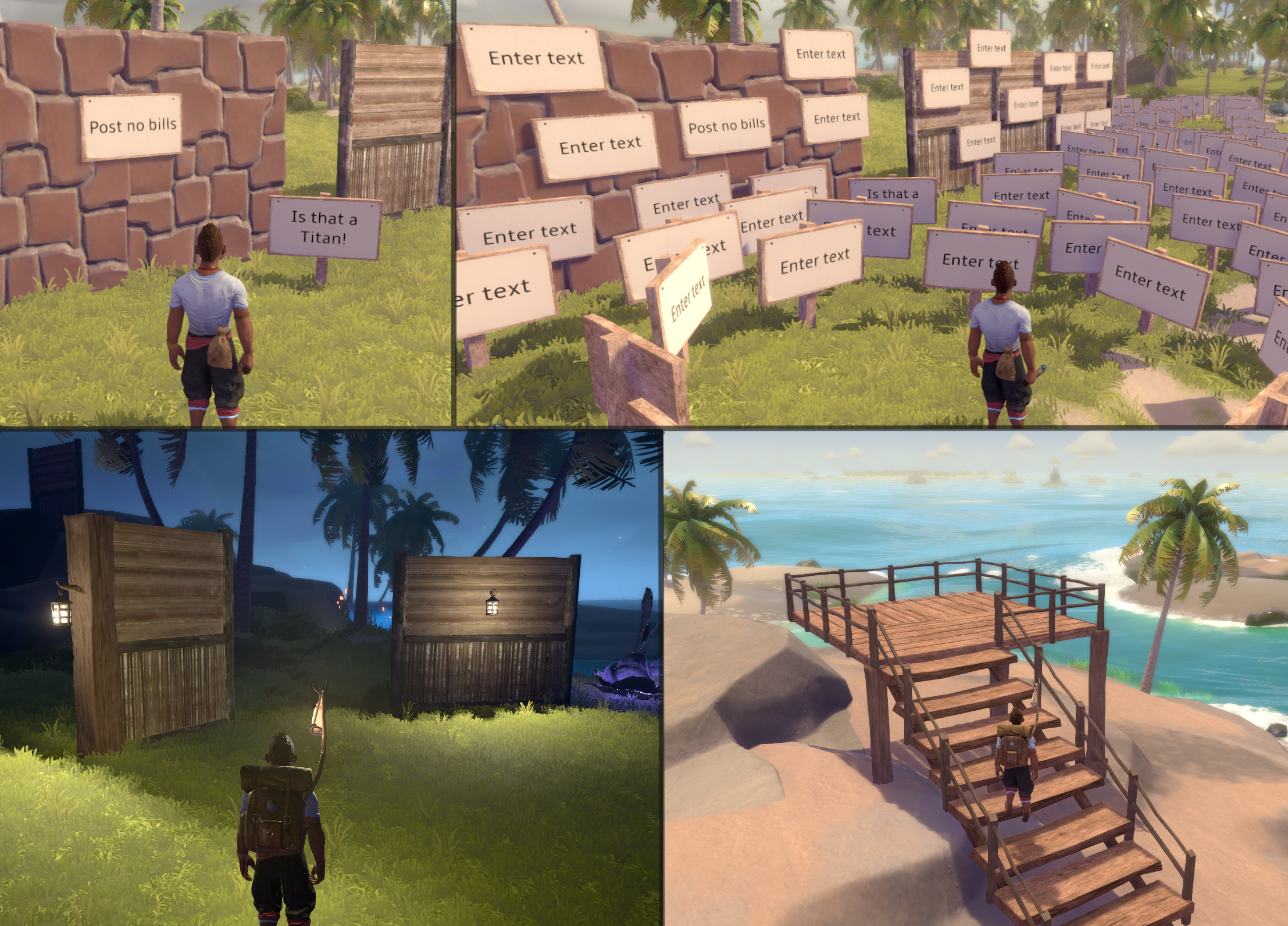 v0.5.84 -Setup Wooden Sign as a build-able item which you can edit the text on. It can be placed on the ground or on walls. -Improved contraption spawn logic so some contraptions can start their placement logic rotated towards you instead of aligned to the world -Improved Golem and Mega golem ranged combat logic and animations -New Wood Floor variant with the board direction rotated so players can align the boards if they want. -Increased golem projectile speed to make it harder to dodge -Improved throw logic to time the projectile with the animation better -Setup flight inverted input option in settings menu. Set the default to not be inverted. -Update to Crab and Yellow crystal water displacement to fade based on water depth -Improved Dock float in place logic -Fixed floating objects popping up out of the water when the player gets in range and their float logic turns on -Updated inventory logic so if you are building a contraption and click a inventory button in the hotbar of the same contraption type, it will cancel building instead of entering the build loop again with the same contraption type -Reorganized quit/save popups from pause screen so it makes a little more sense in how they flow -Improved Player movement "Greased Pig" logic to work better with NPC -Reduced Wood Wall collision thickness -Tightened up stone wall visuals to be closer to their collision size -General bug fixes across multiple places -A combat system bug fixes with Titans