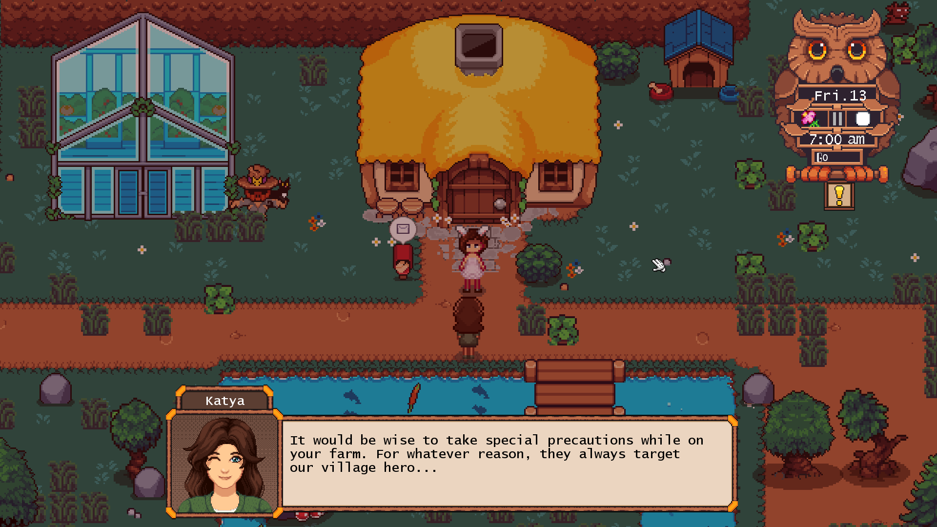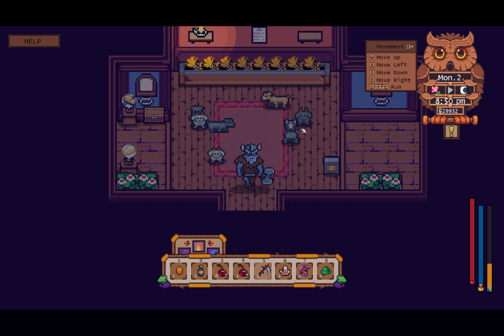 Bugs and Fixes: - Unlocked teleportation spell for the time being for new characters. It’s usually unlocked during a beginner quest, but I thought it would be helpful for now. - Reduced texture page to help with possible lag. - Fixed Natalie stunt-double on her ranch while horseback riding. - Fixed the player’s vampire biting ability that caused a crash with certain monsters (bats, ghosts, squirrels). - Moved Harper to a new spot in the Temple while she’s praying. - Changed the sprinkler’s depth and re-worded its description. - Fixed the ‘Halberd Recipe’ typo. - Fixed the duplicate foraging bug. - Reduced the collision box on stones, weeds, and trees for ease of access. This should prevent getting stuck on these objects as well. - Added normal fish to the list of fishing catches on the player’s farm (which I have affectionately named the ‘Trash Pond’). - Minions will no longer aggro to quest monsters on their own. - Mouse left-click was added as an additional key for refilling your watering can when standing next to water. - Janus the Mirror gives new cooking recipes. - Added a rug into the library to help show you where the Temple is located. - Added a Setting to turn on/off the Gamepad Controller. I still recommend using keyboard and mouse for now until I re-work the controls. - Fixed combat and textbox dialogue causing a freeze when together. - Reduced the amount of objects (grass, trees, stones) that spawn on the player’s farm upon starting. -This should help with any lag for new characters. - Fixed accidentally placing items if your mouse was in the mini-inventory. - Patched Prismatic Amulet and Amulet of Health in the Cauldron not showing properly. - Added ‘Notes’ for the player to read in dialogue with better explanations on how things work. - Fixed the crash that occurred when you have 3.5 hearts with livestock. - Moved the player location in the Unwritten Lands upon entering. - Patched the save bug that caused the player to spawn in weird locations upon saving. - The drone on your farm is easier to destroy. - Increased monster spawn in the Forest and added the Hedgehog into the dungeon spawns. - The Blood Altar ‘y’ position was changed. If yours is still too high, then visit Katya to move it for free. - Fixed fishing sometimes not opening the mini-game. - You can now sell Evergreen seeds. - Worked on Roman’s and Thomas’ dialogue. - Fixed Igloo not being placeable onto the farm. - Werewolves no longer require Silverlight to be killed and decreased their spawn rate on Full Moons. - Prevent objects from spawning after a certain limit to also prevent lag. - Zombie Manor and Menagerie should be built in a reasonable timeframe now. - Added Colorblind-friendly colors into the game. - Fixed the crafting item, bomb, not showing. - Fixed Zombie Manor x and y locations upon exiting. - Added a ‘Starting’ Chest when you begin a new character. - Added fall and winter art to the beach. - Replaced the numbers on the chest with pictures for what it does instead when you click on it. - Fixed Yeti portrait art. - Increased the spawn rate for worms. - Fixed goblins not completing their dying animation on level 20. - Added a ‘Confirm Exit’ text when leaving the game. - Fixed the entering Barn and Coop bug. - Fixed the Iron Breastplate crash while equipping it. - Fixed the shower for transformed players (werewolf, wendigo, bat, giant).