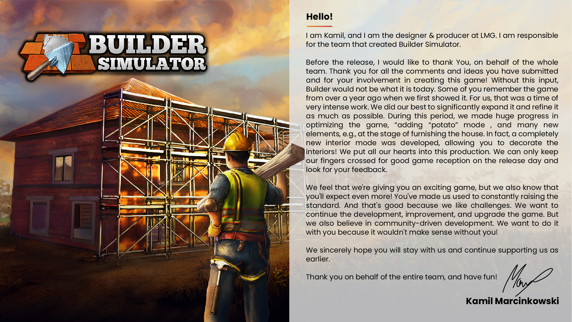 We know that Builder Simulator is a long adventure we want to go with our community that's why we've decided to share some cool stuff with you๐ We are proud of you and we consider it an episode one and believe is sooo much to come๐