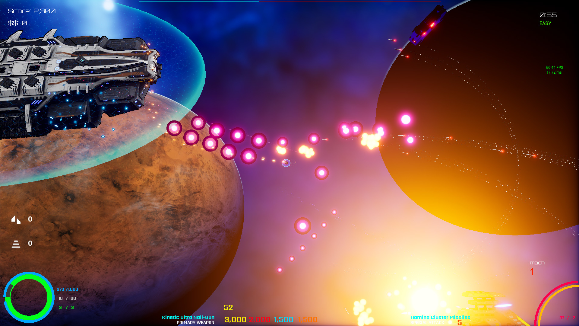 Fixed the lighting in the Main Menu. The Main Menu now includes a link to the Discord. Fire Mission action (default middle mouse button) now spawns an effect showing which enemy capital ship your fleet will be firing upon. Fixed Event systems not spawning enemies nor allowing you to continue the game. Fixed collisions for multiple enemy capital ships. Store systems now bring up the store. Added a visual effect showing when the Player's starfighter is being healed and reloaded when within mothership range.