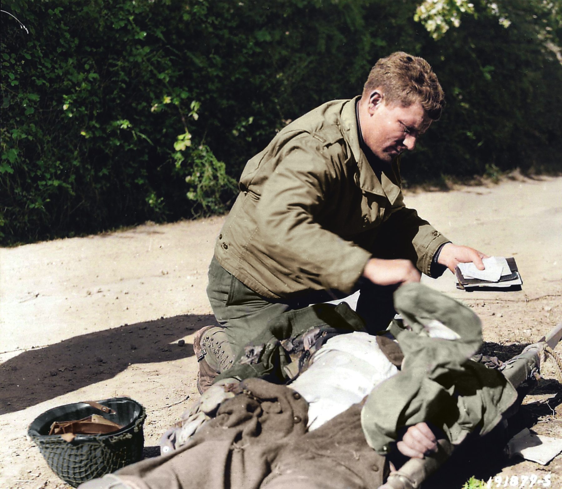 A Chaplain of the 1st US Inf Div collects personal effects from a dead G.I. Colorized by historical media team member Kirill. Original from https://www.flickr.com/photos/photosnormandie/6381756709/ Change Our Logo? April 20, 2024