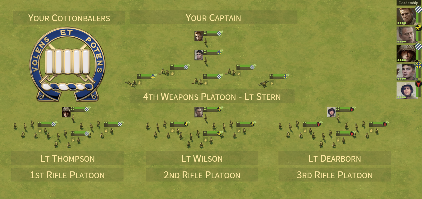 Your leadership on the right, and on the field: -- Captain - Lt Wilson - vet. Too old a vet? - Lt Thompson - eager. Too eager? - Lt Stern - an ax to grind... - Lt Dearborn - Thinks he knows best. Does he?