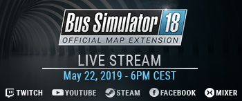 To celebrate the release of our official map extension for Bus Simulator 18 we have planned a livestream event for you. The livestream will start on May 22, 2019 at 6pm (CEST). During the livestream Julian of the stillalive studios developer team will not only present you the new city districts, routes and tourist attractions, but also answer questions of the community. We hope you are looking forward to it the same as we do!