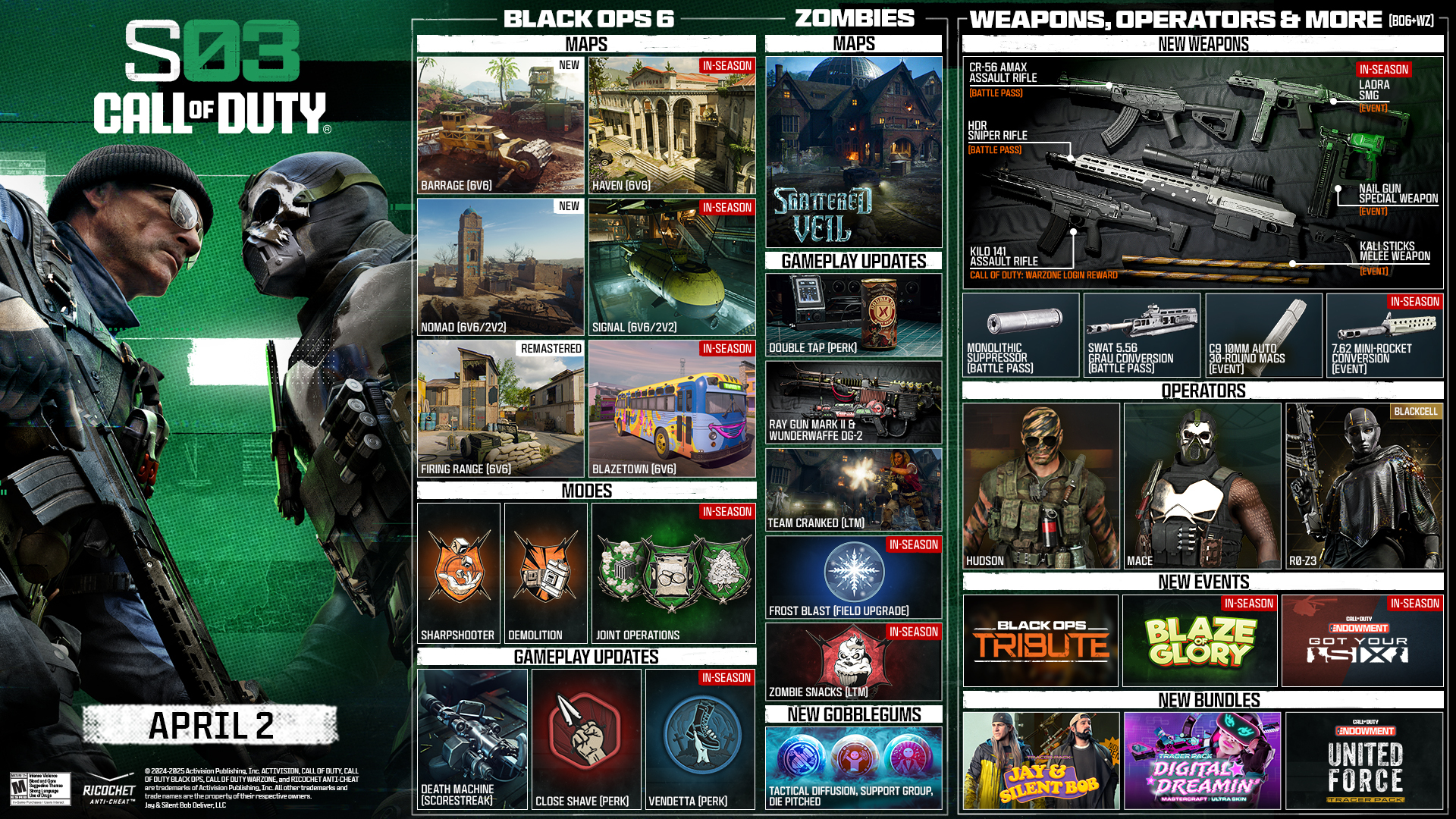 Turn the tide on the Pantheon spies with this massive offering of free and premium content coming to Call of Duty®: Black Ops 6 when Season 03 launches on April 2 at 9AM PT, with Call of Duty®: Warzone™ going dark for 24 hours before Verdansk comes online April 3 at 9AM PT.
