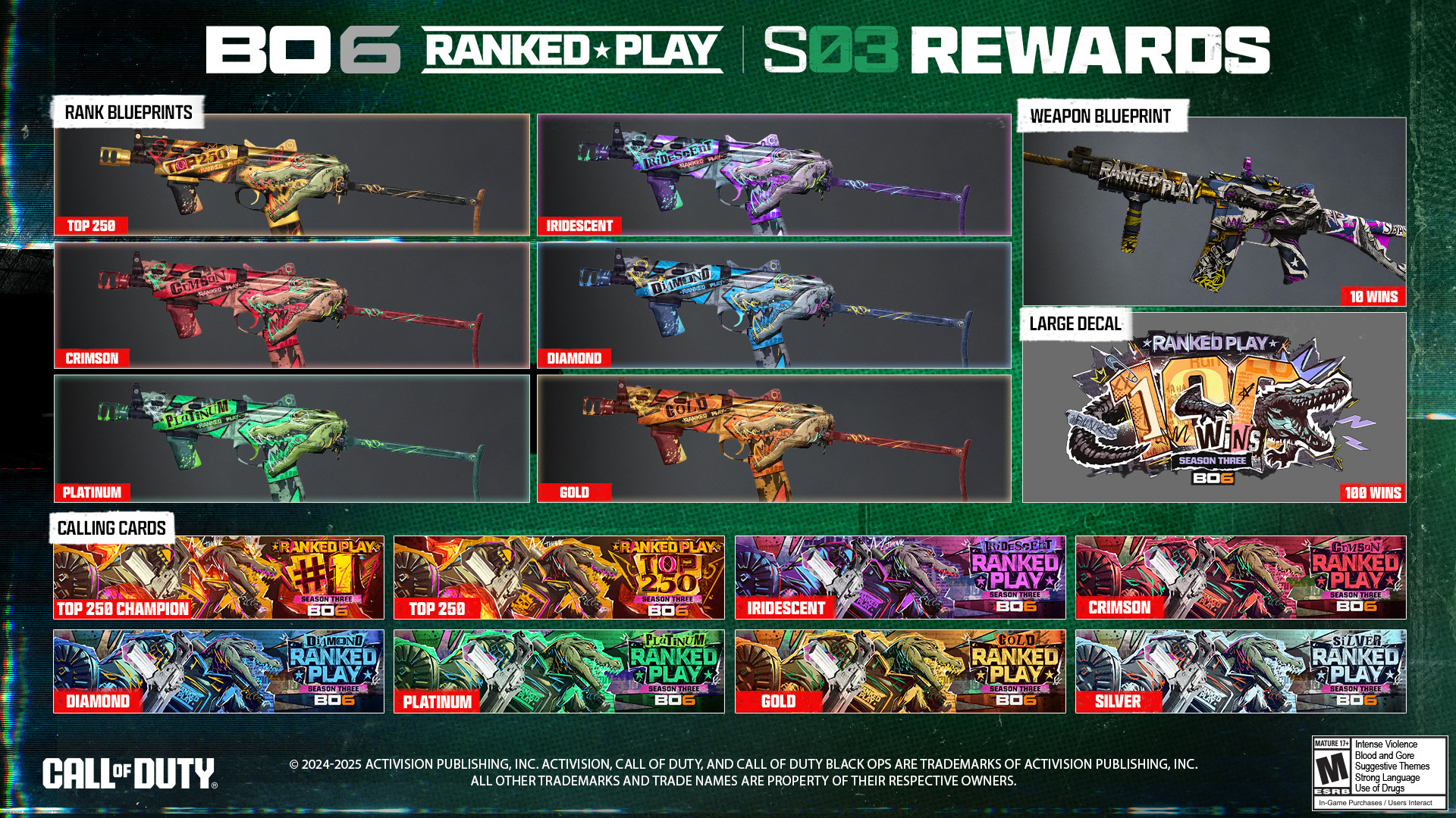 Get wins and progress through the Ranks throughout Season 03 to earn new seasonal rewards like a new Pro Issue Weapon Blueprint, Rank-themed Calling Cards, and more: