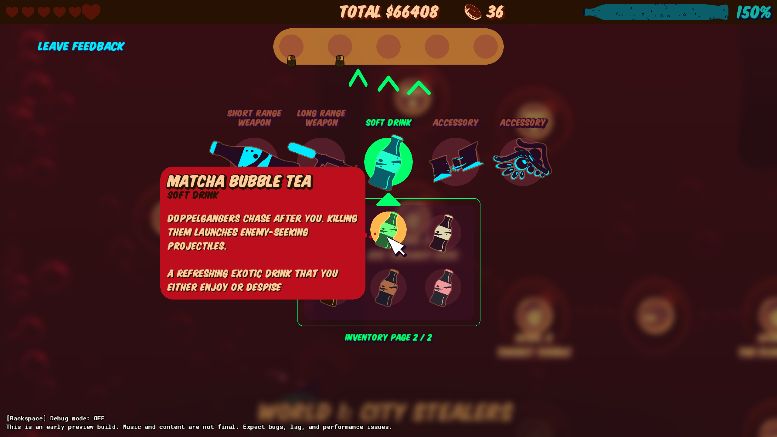 --- New feature: Endless mode - Clear endless randomly generated levels in an arcade rogue-like game mode! - Levels reuse existing campaign mode levels but with entirely generated waves - Choose a soda hero to play for the run - Swap weapons by picking up new weapons in the level - Acquire character upgrades for the run by leveling up through collecting money - Don't like an upgrade? reroll it! - Get score bonuses for taking no damage or beating the level quickly - Endless mode uses separate save files from campaign mode - A few more planned features for the mode in the future: High scores, soda unlock challenges, more UI/Feedback tweaks, progression system for unlocking items/weapons, achievements