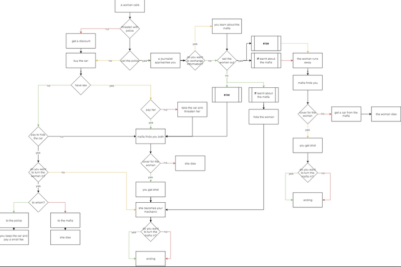 In recent weeks, our teammate has been working on creating the entire story path in the game. There was a lot of work to do because different collisions had to be taken into account due to the player's choices. The picture below shows a simplified mind map of the process of creating a story path.