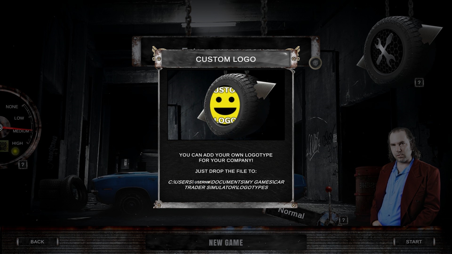 First off - logo. Logo is what most people think of when they say the name of any company. We have some logos prepared - you can choose from many variants and shapes! It is also said that logos can be positive or negative in perception. In this example I chose a logo with a speedometer. Why? Because my company is going off quick, straight to the target! And the target is to make our customers happy! But it wouldn't be great, if we could add our own logo? Well - yes and you can! In order to do that you must add your own logo to directory C:/users/username/documents/my games/Car Trader Simulator/ Logotypes