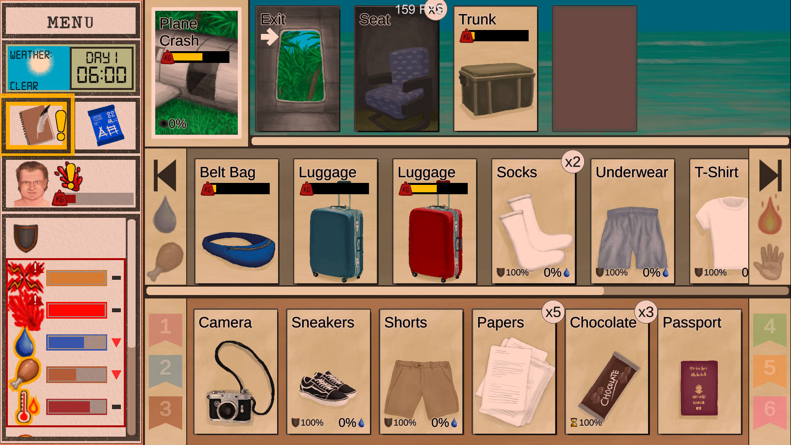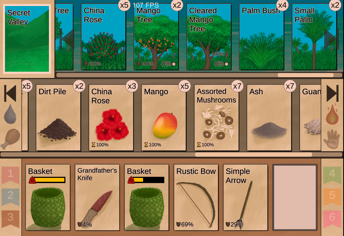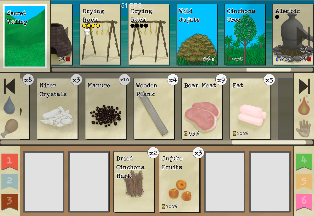 - Fixed a bug where boiling salt water would not yield salt when the boiling happened offscreen. - Potential fix on the big bad bug where lots of cards would disappear in the top row after travelling to an area. - You can now build rafts in all coastal environments. - Bee suits now also protects against bugs. - Macaque Skewers now also accept chilli powder. - Fixed Issues with multiple Palm Trees losing their coconuts at the same time. - Increased coral drop chances. - Dragging Stacks is now faster. - Wound screen now always start to the left when open. - Weather indications no longer appear on main menu slots. - Tweaks to card special durabilties. - Fixed a bug with the scrap spear. - Fish Tacos now also accept dried Chilli and Chilli powder. - Milking goats now only costs a minitick. - Fixed a bug when taking pictures to monitor lizards. - Fixed an issue with the Tourist's souvenir mission. - Tweaks to the fonts. - Fixed an issue with roof damage not working properly. - Treenails now unlock earlier. - All fires can now be fed with stacks. - Fixed a bug that was causing glasses to get damaged on some wrong events. - Chests and Trunks are no longer damaged by storms. - Dragging stacks implemented. - Tweaked blood loss system. - Tweaked Tourist start. - Fixed an issue with the cut shavings action. - Fixed some issues with the sharpened stone blueprint. - Increased coral spawning chances. - Fixed a visual bug where luggage would change colour. - Fixed a bug that was causing plane seats to dissappear. - Plane Trunk can now accept Jerrycans. - Luggage can now be placed on the location row like baskets. - Fixed a bug with the scrap spear. - Fixed a bug that was stopping macaques from raiding some indoor environments. - Added missing raft art.