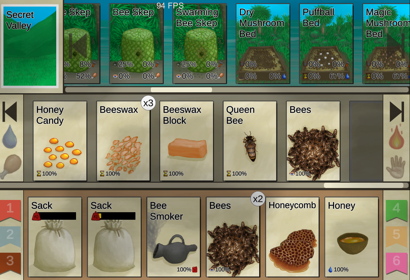 You can now drag cards to the entrances of indoor environments to move things there without having to enter. This works for mudhuts, sheds and caves as long as the entering the place does not have a tick cost (so it doesn't work for the cave system in the highlands). Hopefully this will help reduce the time spend in loading screens while we work on improving performance. ;)