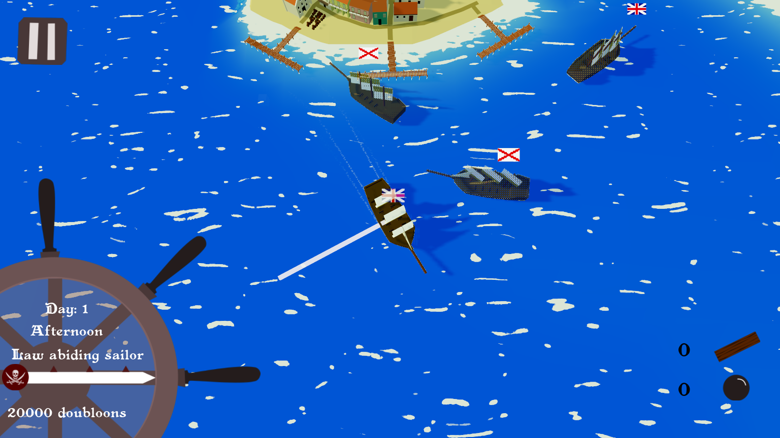 -Improved starting conditions by giving player 1000 more doubloons and some cannonballs to start with -Added reminders to the player to remind them to buy cannonballs and timber