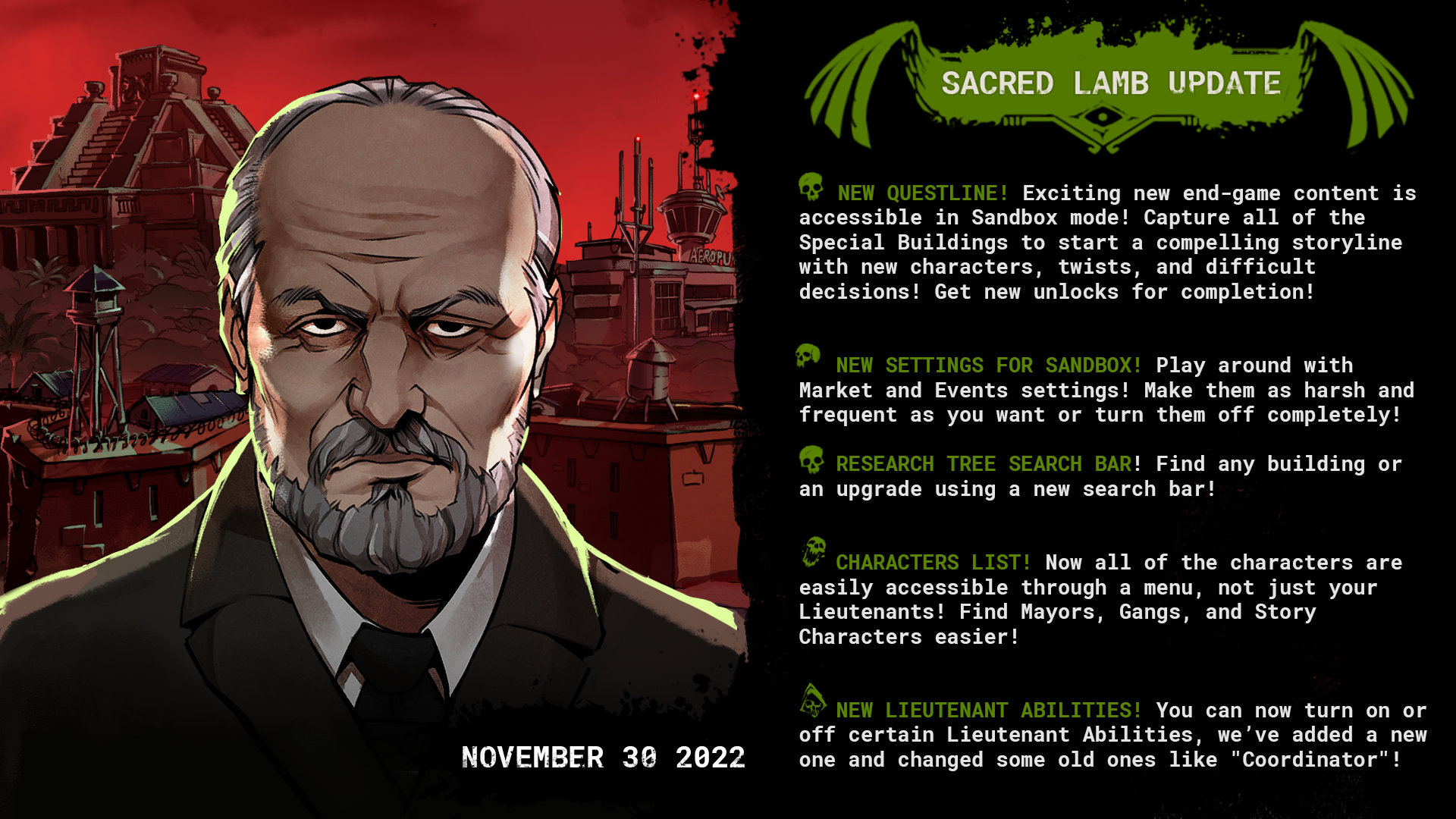 ːcartel_loveː A New Questline. Exciting new end-game content is accessible in Sandbox mode! Capture all of the Special Buildings to start a compelling storyline with new characters, twists, and difficult decisions! Get new unlocks for completion!