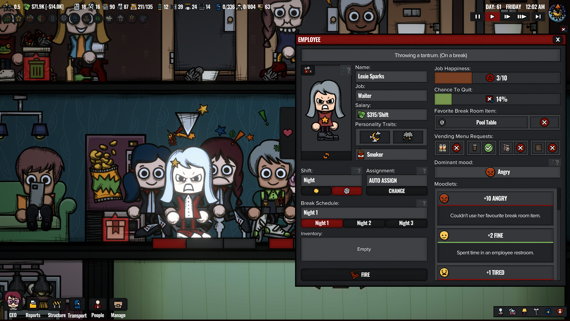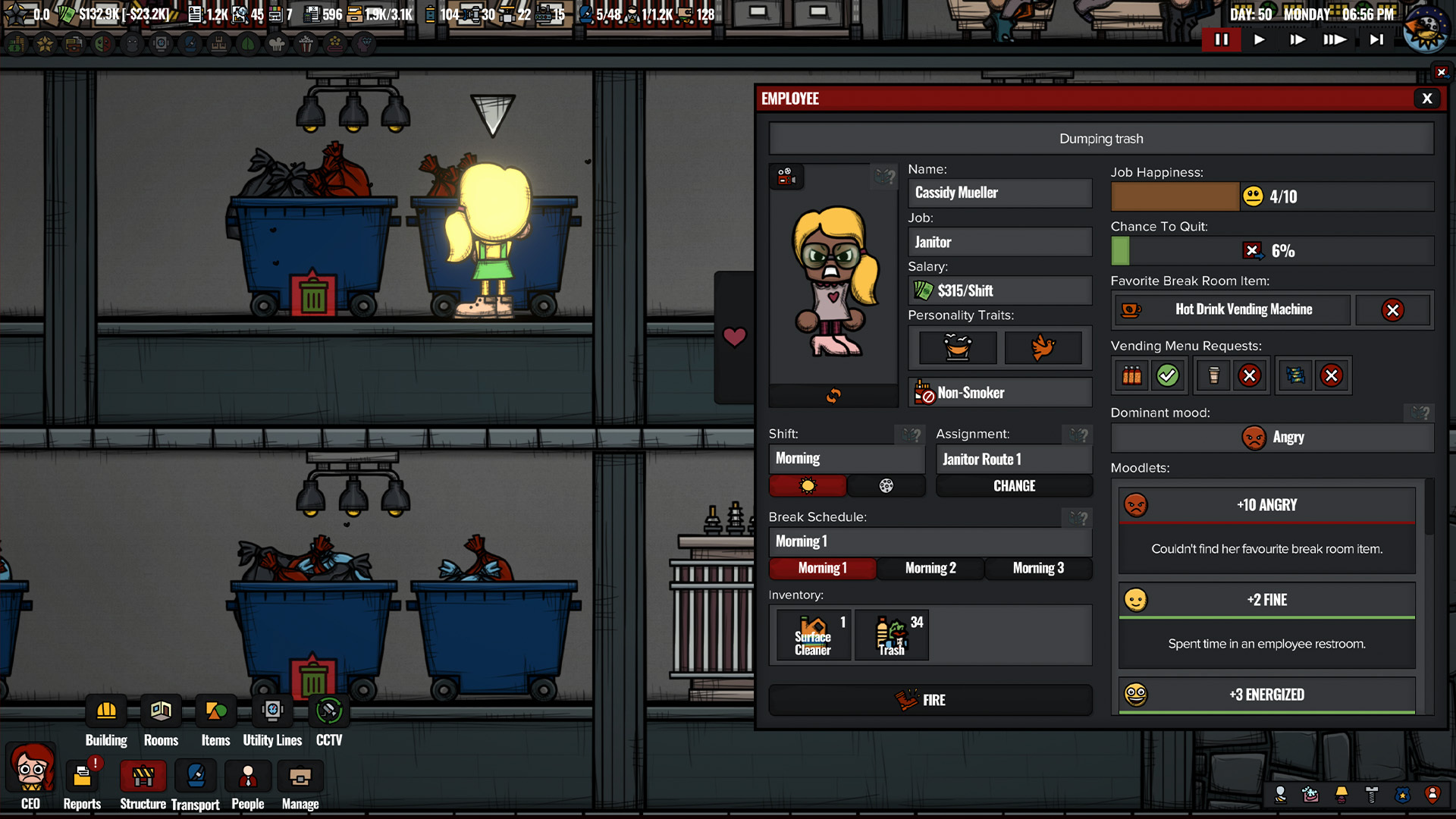 People Inventory System: You will now be able to clearly see what people are carrying on them from their menu, such as trash bags for janitors, menu items for customers, tools for maintenance officers, and so on.