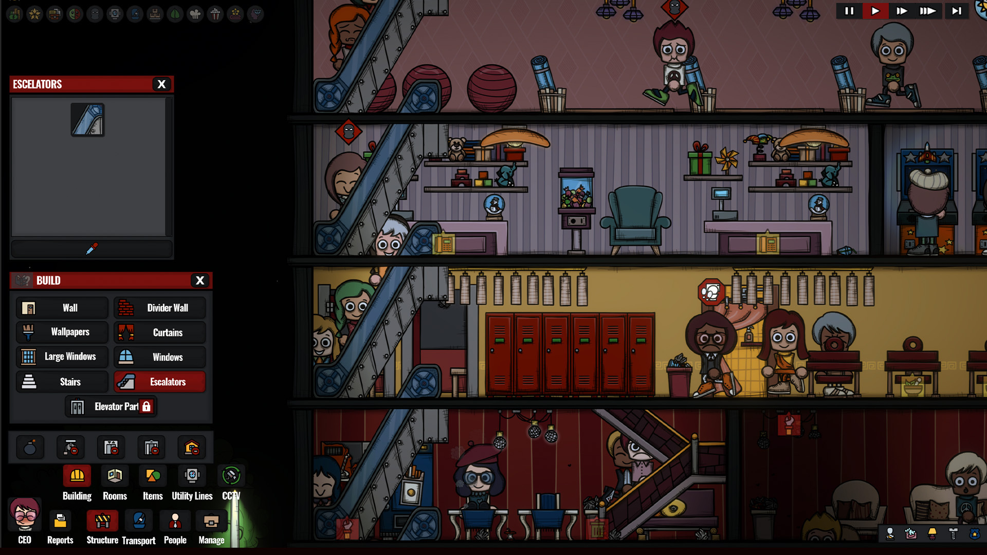 Escalators: Escalators have been added as a more guest-friendly alternative to stairs, especially in places where you don't want to place elevators. Customers will now leave if they have to climb more than 5 stairs to reach their destination, but this limit is extended to 15 for escalators. If an escalator isn’t powered, guests will treat it as regular stairs. Additionally, I’ve increased the movement speed penalty for stairs. The image shows the current state from the public test, but we've decided to make escalators 2 tiles long instead of one. More varieties, like stairs, will also be added.