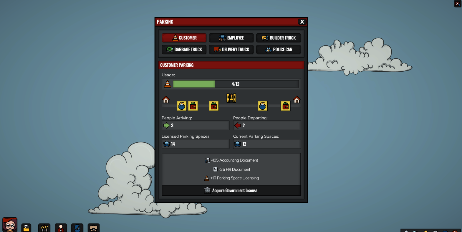 I’ve also worked on a new parking menu that doubles as a handy data minimap and a place to buy government licenses. It shows who’s arriving and leaving, the number of licensed spaces you have, how many are in use, and other useful insights.