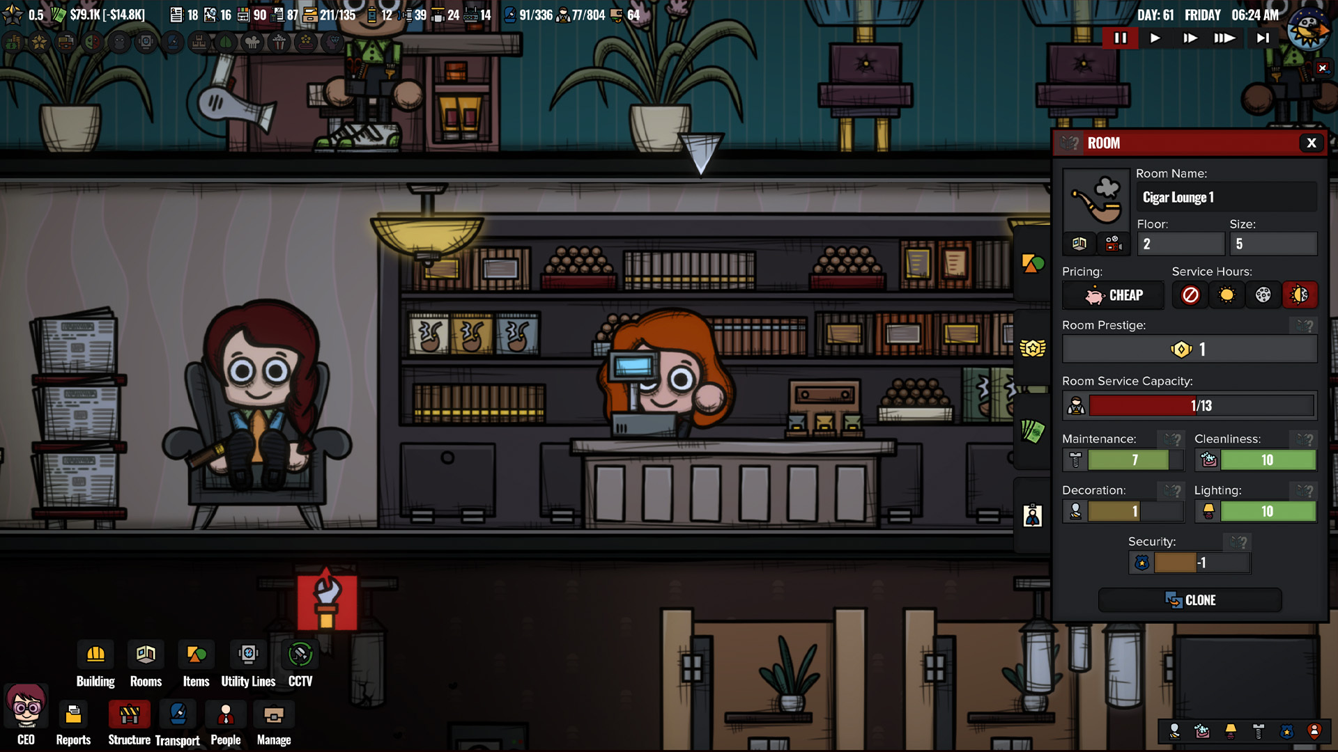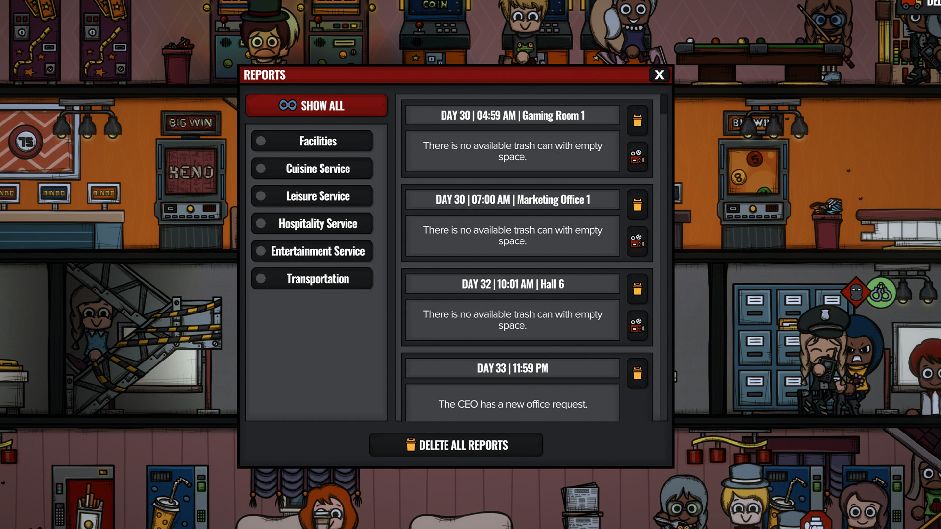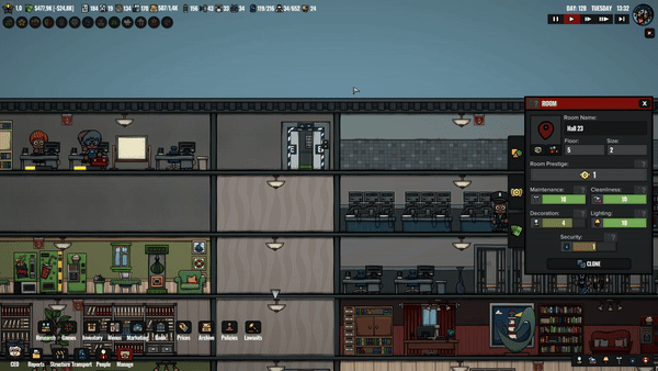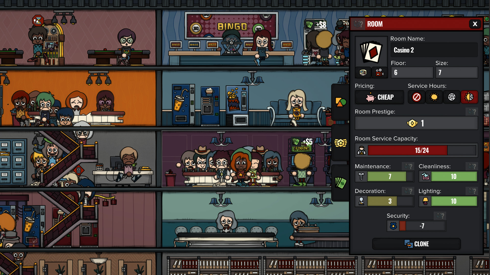 Thanks to new sign drawings from Nil, rooms now display small signs that you can hover over for important updates. These signs highlight issues like essential item shortage, pathfinding problems, construction status, and low room ratings depending on the room type. This update adds a clearer, more intuitive layer of management to your casino hotel, ensuring you can address the issues you choose quickly and efficiently.