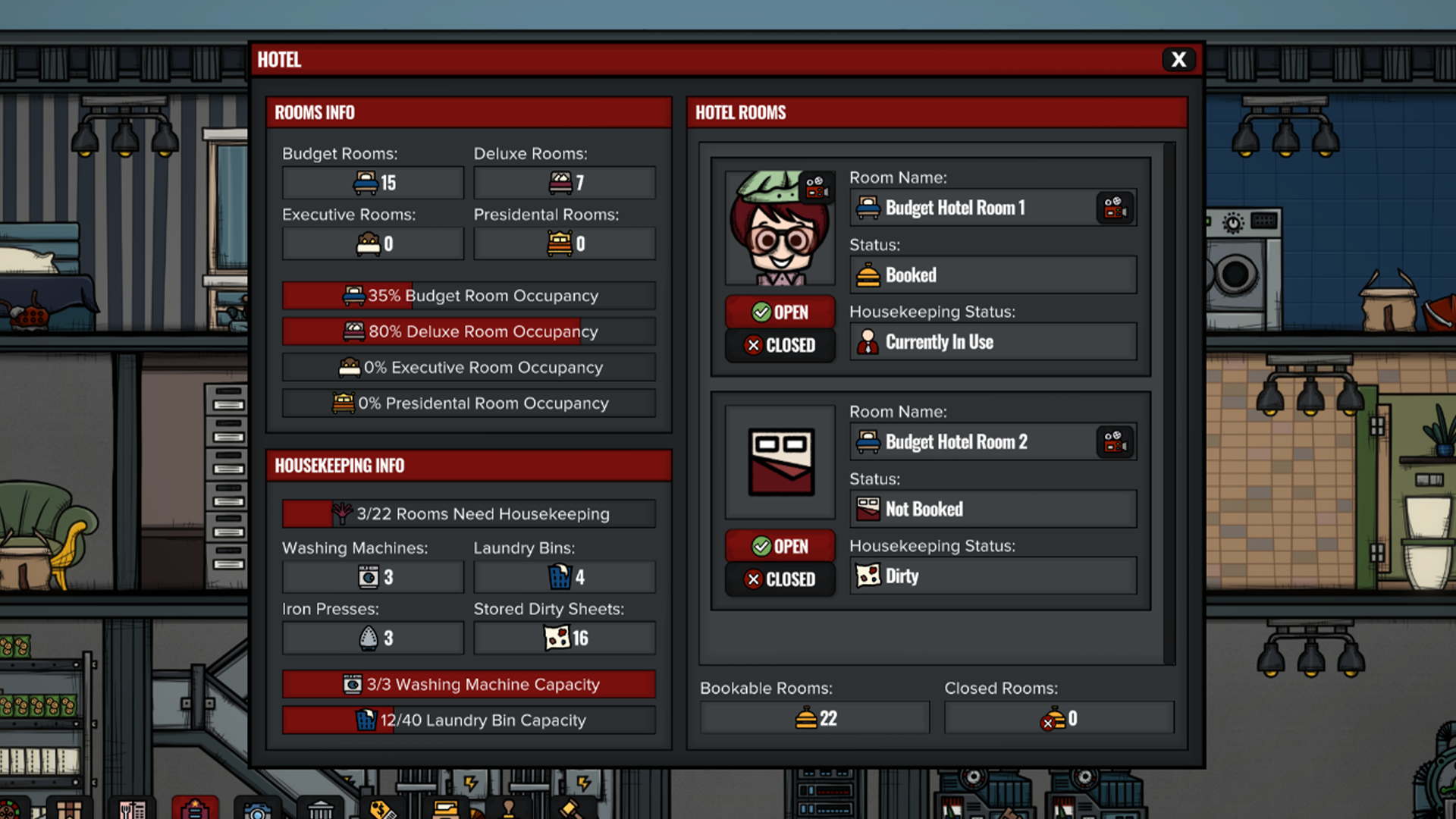 Dirty sheets will now function as physical objects within the game, similar to trash in the waste management system. You’ll need to store these "by-products" of guest services and remove them efficiently. Housekeepers can collect and deposit dirty sheets into laundry bins, which can then be processed in washing machines and iron presses. The new system encourages players to identify and address bottlenecks by managing housekeeper numbers, storage capacity for dirty linens, and available washing machines and presses. And the new hotel menu, along with detailed data graphs, will provide all the insights you need to stay on top of things!
