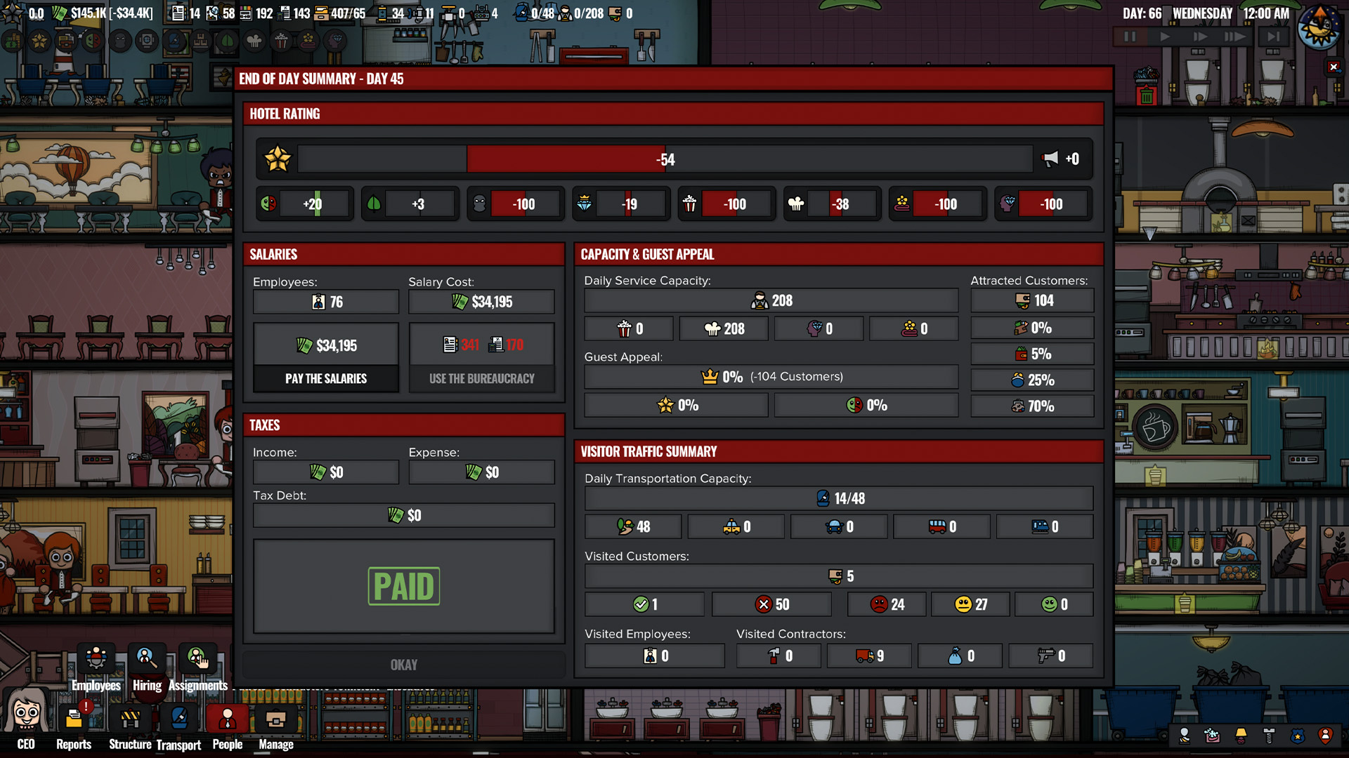 Rating System Refactoring: I've overhauled the hotel rating system, changing how ratings are sampled and adjusting level thresholds. Basically, daily ratings will now vary between -100/+100, making it clearer for you to make informed decisions about your casino hotel and giving me clearer numbers to work with while balancing the game.