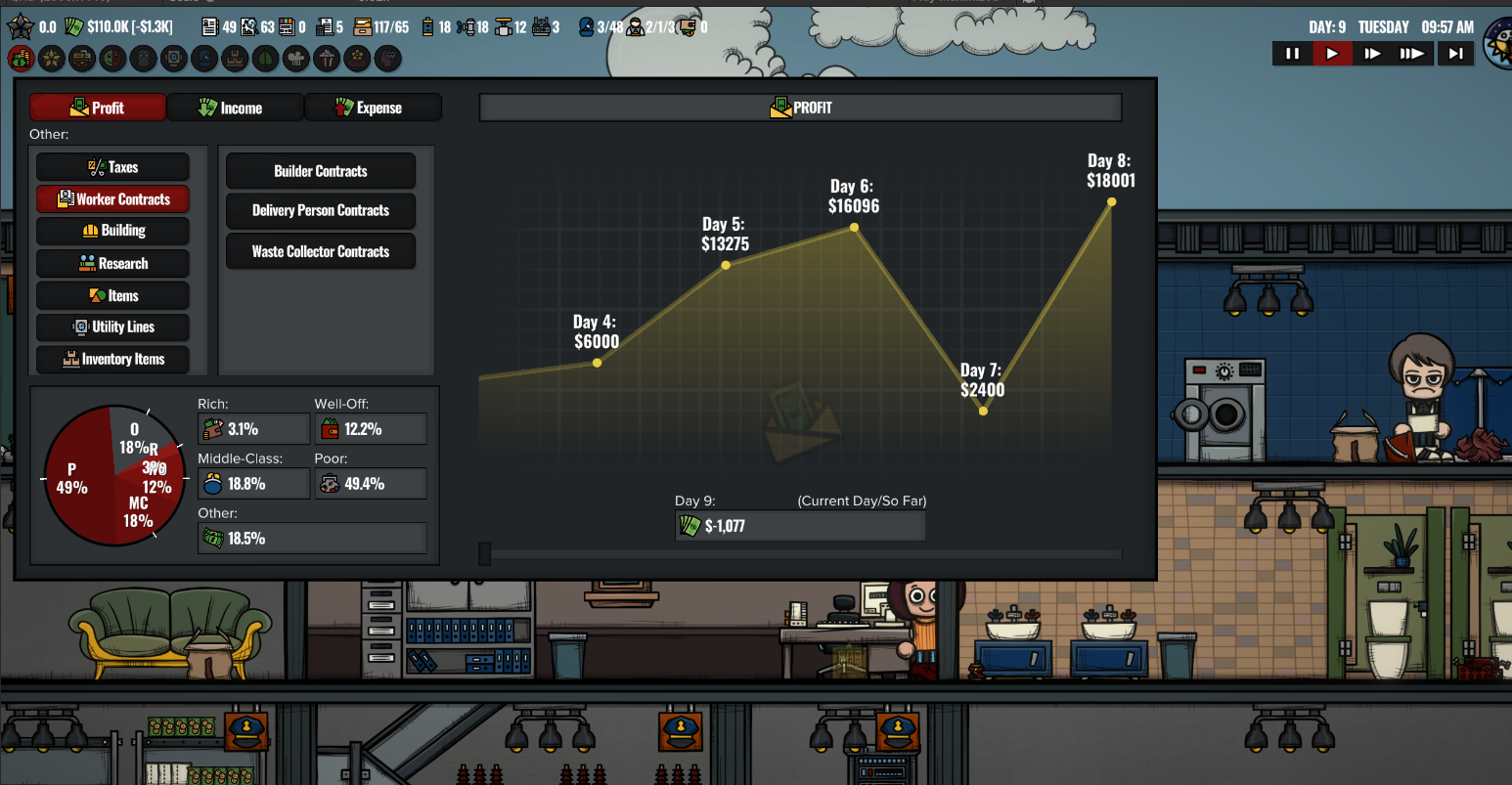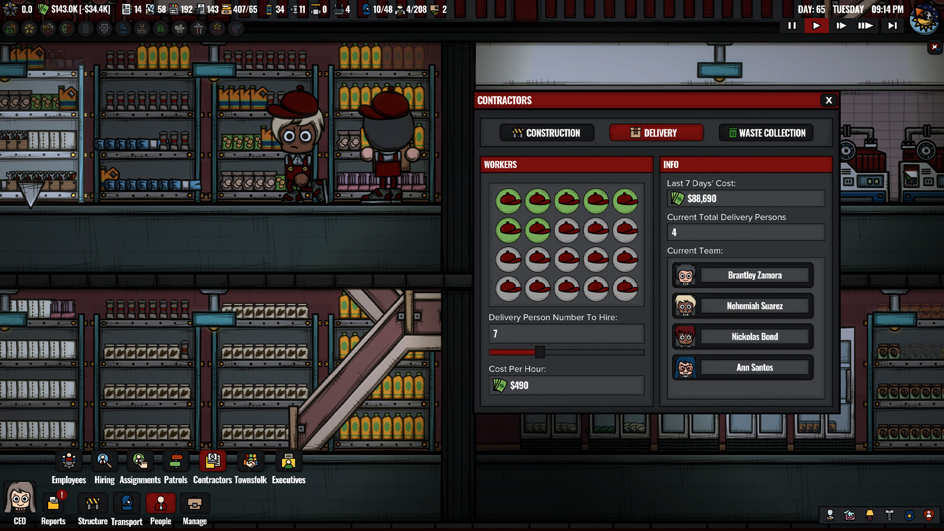 Contractors System: You can now select the number of outsourced workers such as builders, waste collectors, and delivery persons you want to hire using the contractor's menu. However, these workers also have an hourly rate calculated based on the number of people you call.