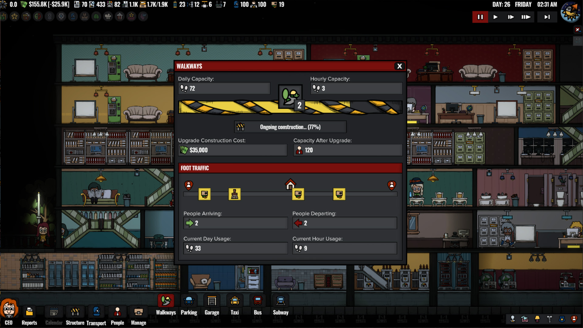 Daily Attracted Customers: The new mechanics now include a finite number of daily customers, based on both service capacity and hotel rating, rather than just an instant number of attracted customers, with the help of new walkways and transportation stuff. This makes each customer more valuable to manage and send off happy.