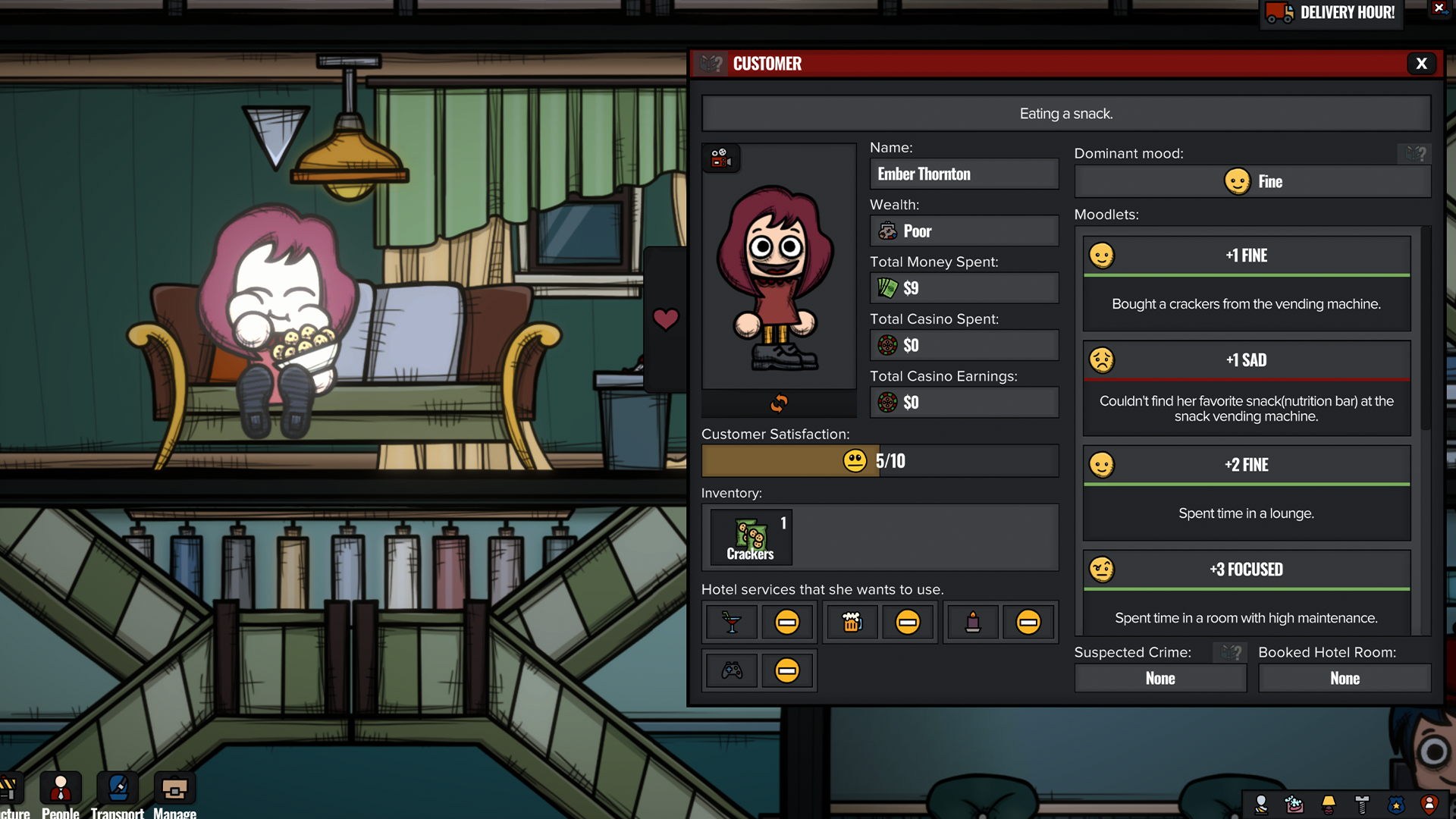 Item Usage Queue: In the old system, folks would wander around items they wanted to use, and whoever checked back first got to use it when it was free. Now, items have a queue capacity. People will form clear lines to use them if they're queueable. They'll enter the line, start a timer, and if they wait too long, they'll get angry and leave the casino hotel. You can see how many people are in line, the order of people, how long they've waited, and if they're happy by hovering over the queue or using the item's info menu. If the usage position of the item is on the left side, they'll start the line on the right side and vice versa. The line will always stay in the room and curve to the other side if necessary. This system also talks with the new room capacity and renewed hotel rating system.