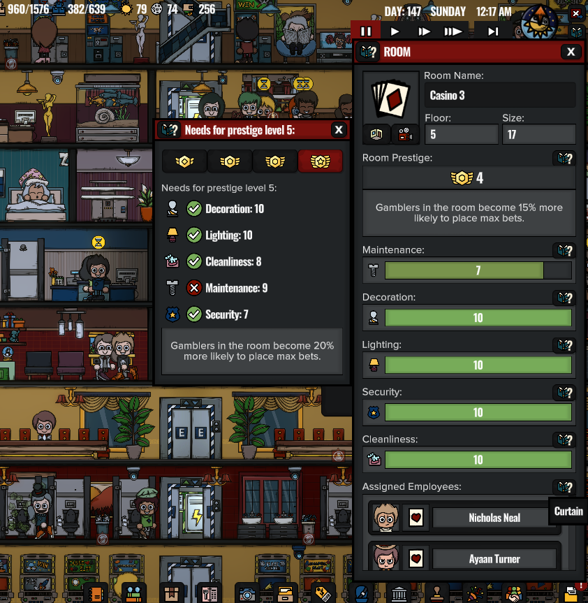 Introducing an exclusive experience for our esteemed patrons. A new type of casino room for wealthy customers. You can set the betting prices of this room separately from the pricing menu and its base prices are higher than the regular casino room. It has slightly different needs for each prestige level and customers with a 'Poor' and 'Middle-Class' wealth type don't use this room.