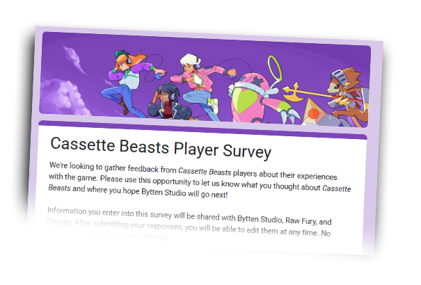 We've also put out a Cassette Beasts Player Survey that will help us determine the community's thoughts on Cassette Beasts: what you liked, disliked and what they'd like to see next from Bytten Studio. Tell us how you feel about Cassette Beasts! Click here to fill it out.