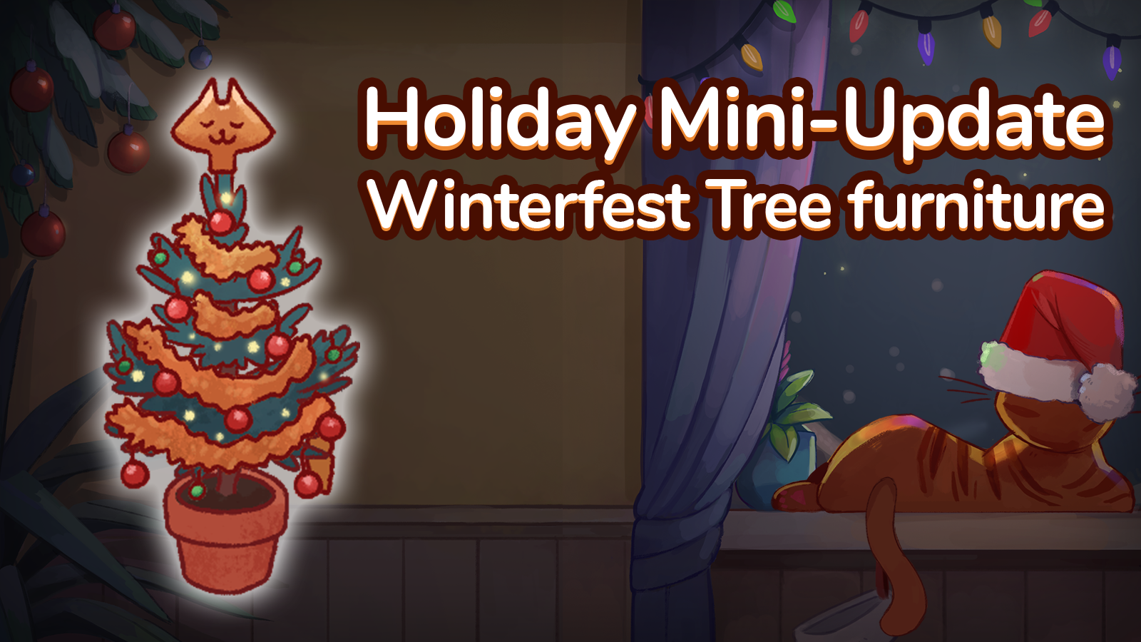 A new piece of furniture: The🎄Winterfest Tree! Buy this at the Plant section of the Furniture shop to bring the cozy holiday vibes to your cat cafe!