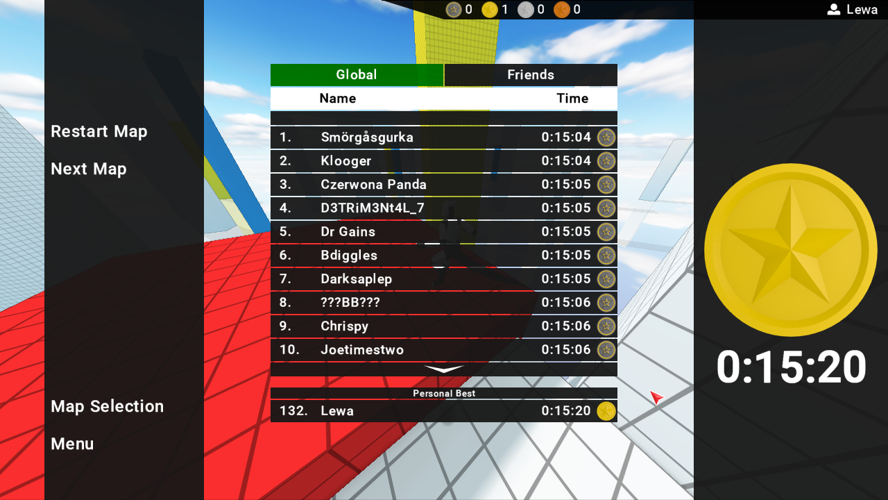 - fixed bugs where repeatedly refreshing the leaderboard (by clicking on global/friends) would cause duplicate entries to appear - added leaderboard to the end screen of a run so that you can easily compare your times with the rest of the community. (without having to go back to the map/level selection screen) - added the ability to invert/mirror the Y axis on mouse movement at the request of the community - fixed minor physics bug - selecting a map on the map-selection screen will automatically preselect your personal best time to race against if such a record exists. (Previously it selected the next higher ranked medal compared to your personal best time.)